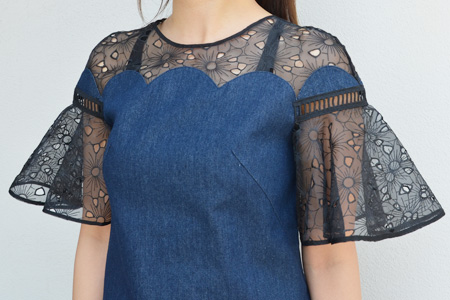 デニム自体はオフショルのようなデザインで、胸元上から全て黒レースで肩やデコルテが覆われています。