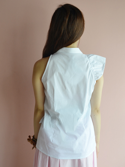シャツというかっちりとしたアイテムにあえてワンショルダーのようにみえるこの遊びの効いたデザインが、非常にお気に入りです。