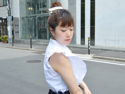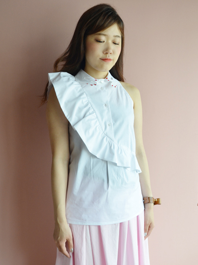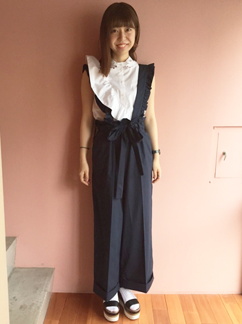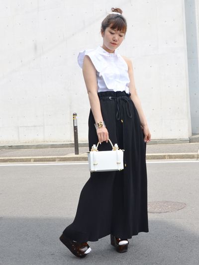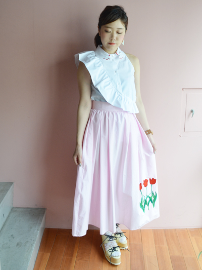 ボトムにinして、斜めに走るフリルの流れをしっかりと主張させる着方がおすすめです。