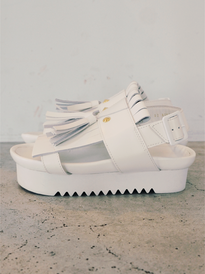 正面のフリンジもよくあるボヘミアンな糸やコードを使ったものではなく、レザーでつくられた都会的なデザイン。