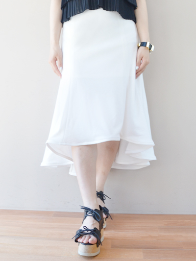裾に向かってボリュームの出るAラインと、視覚を楽しませてくれるアシンメトリー、ハンカチの角を垂らしたような、ジグザグになったヘムライン。