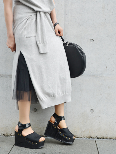 先程はペタンコのサンダルと合わせていますが、ヒールでもOK。