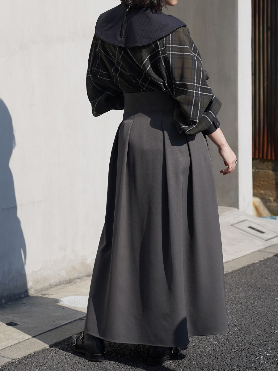 特にグルカなどのウエストをキュッと見せてくれるスカートを選ぶと袖のぽわんとしたシルエットや素材感が引き立ちます。