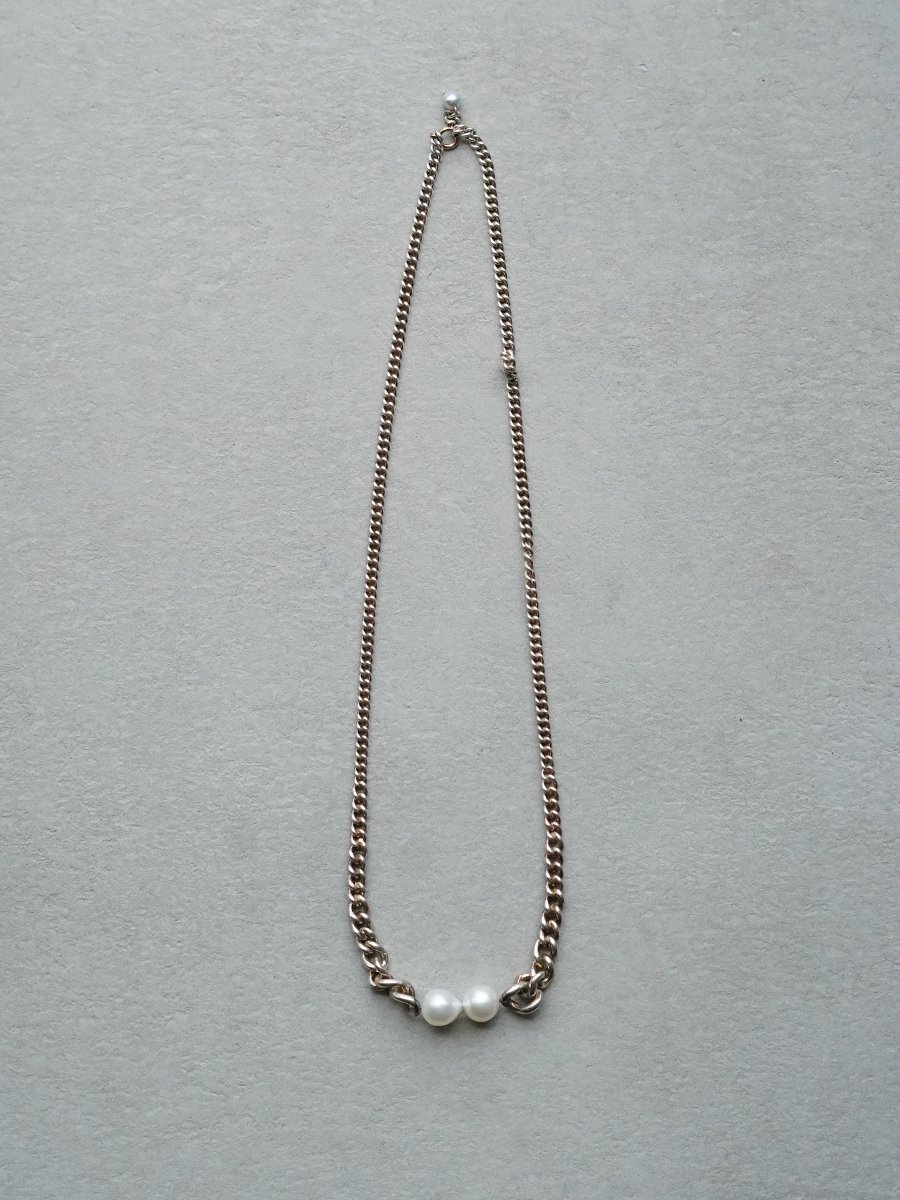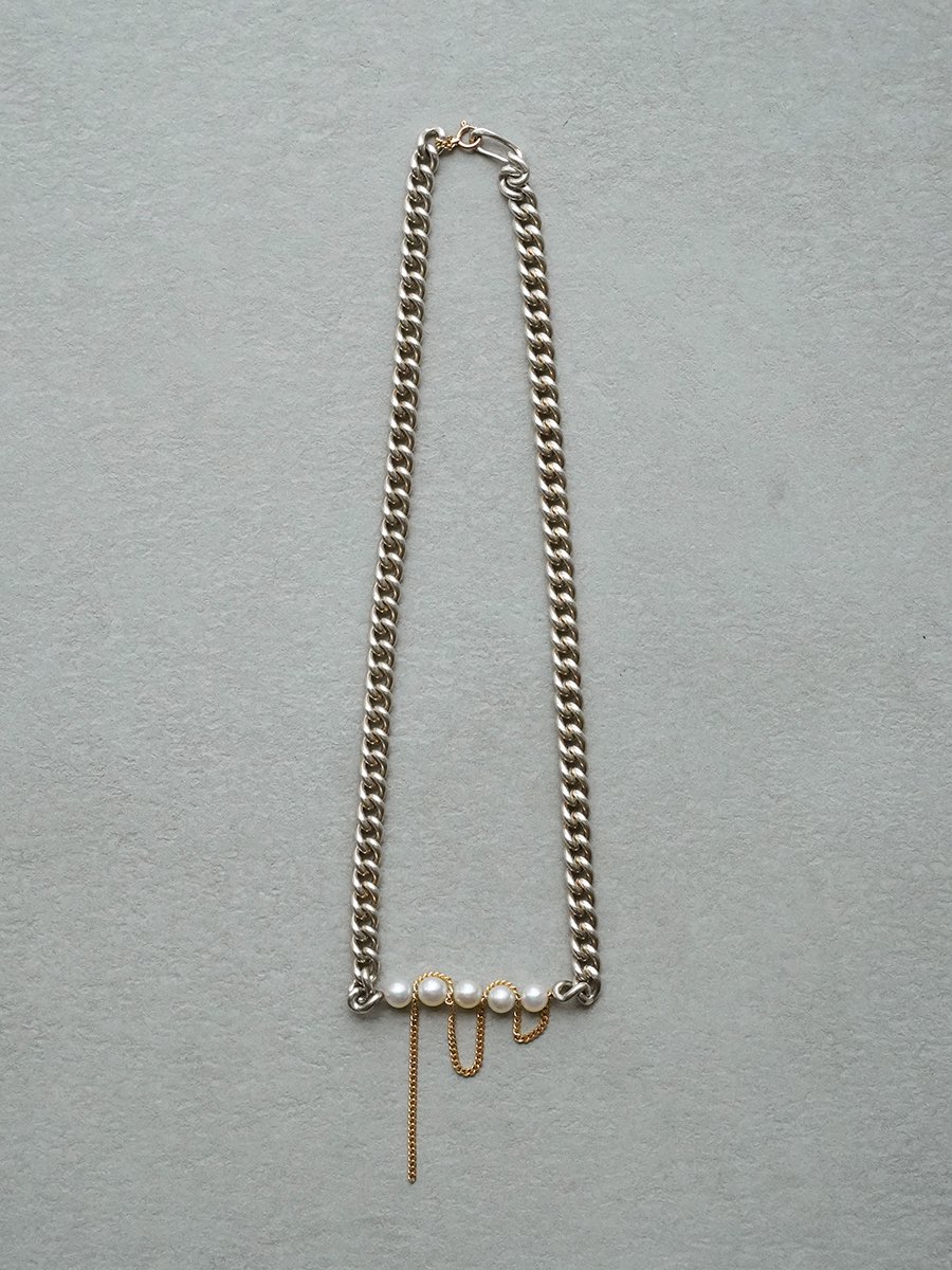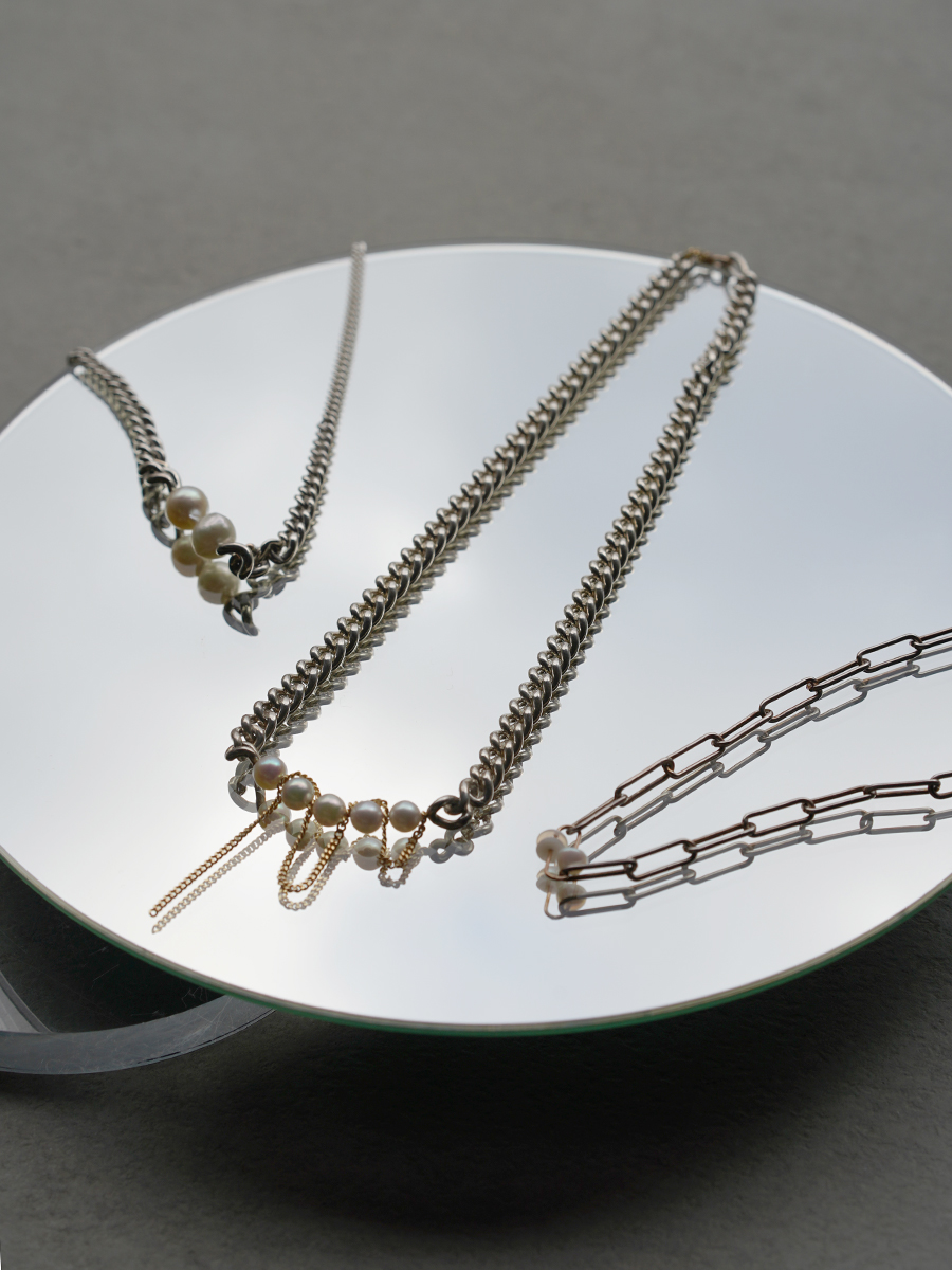重量感あるチェーンと上品なパールの対比がとても魅力的。