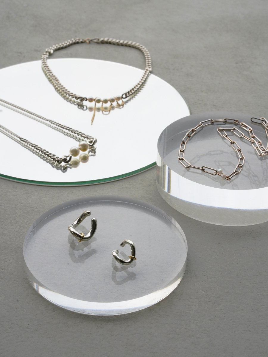 線の細いジュエリーにも適度なボリューム感をプラスしてくれて、クールな印象に仕上がります。