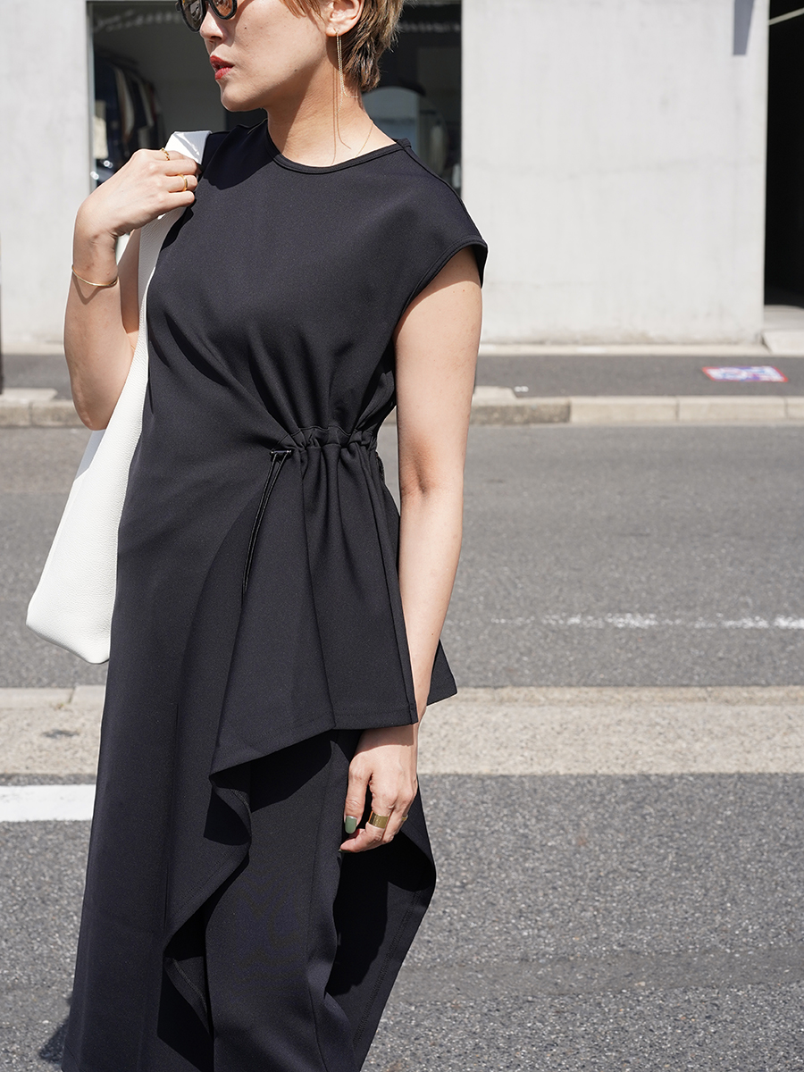 左身頃に前から後ろにかけて大胆に入ったドローコードでギャザーを寄せています。