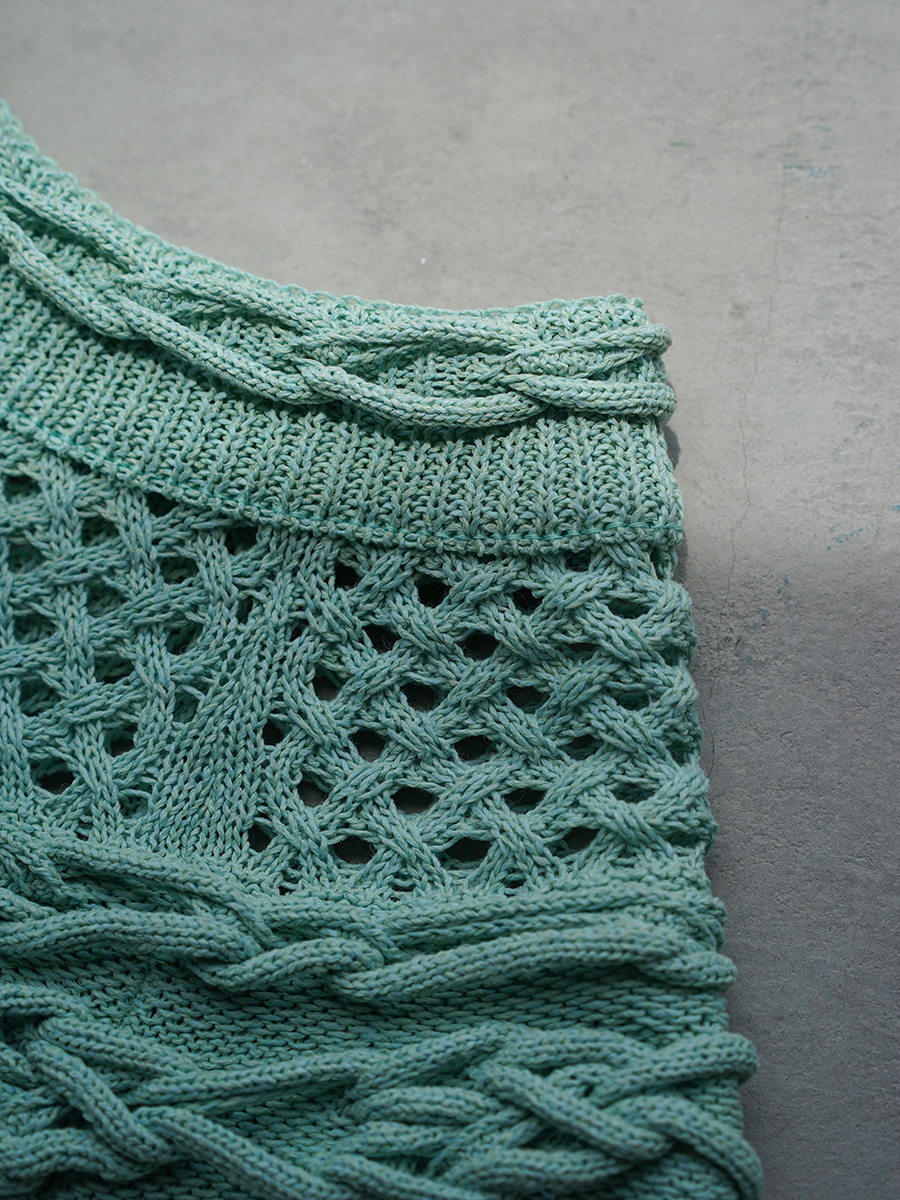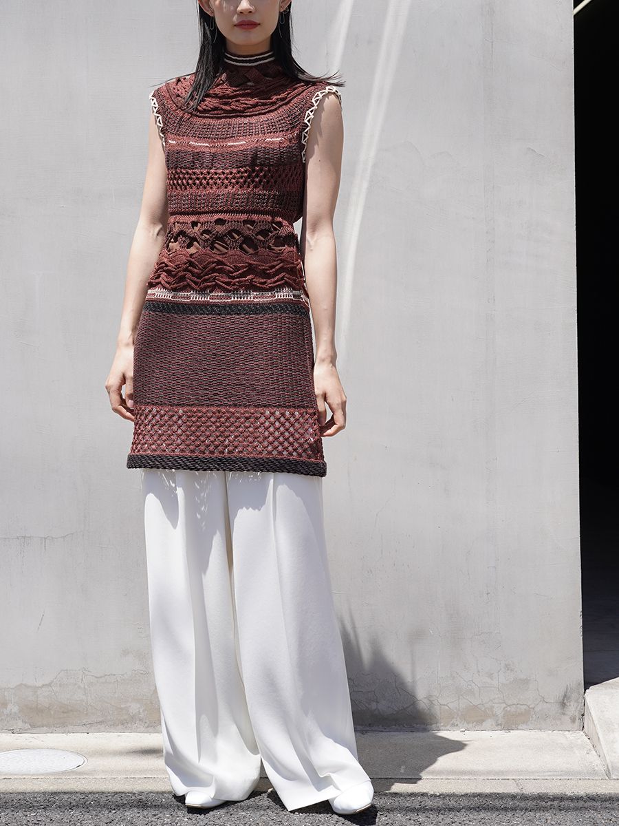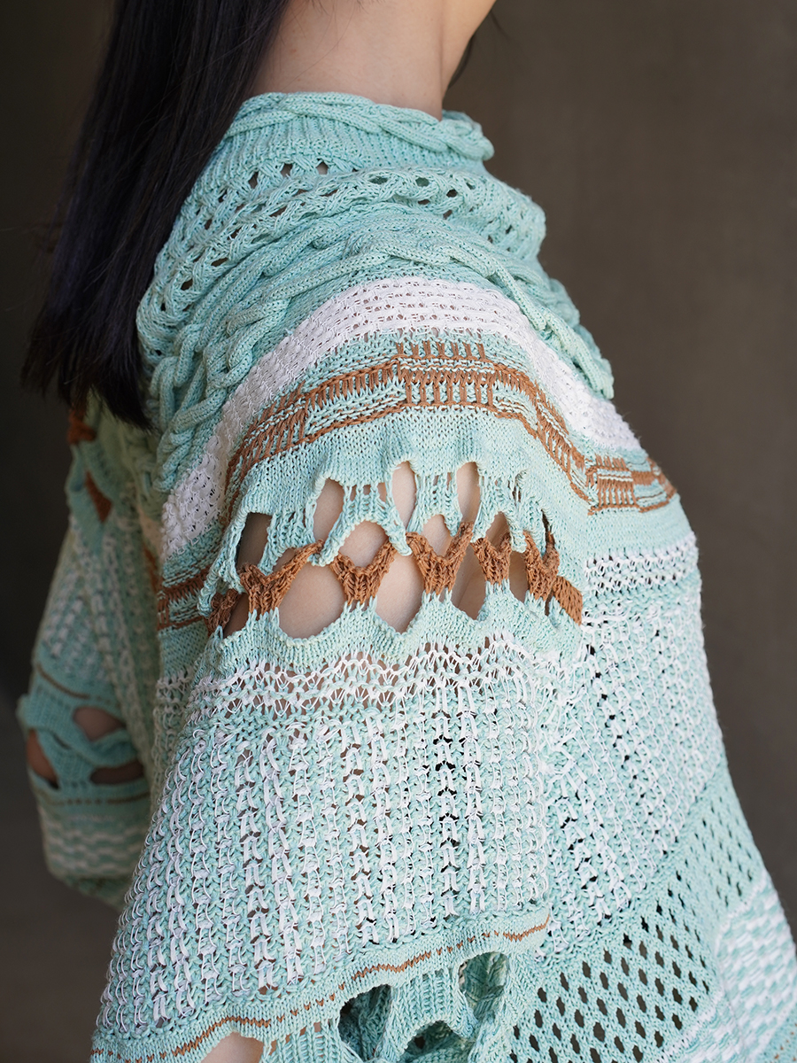 緻密な編みと大胆な透かしによるメリハリが効いていて俄然お出かけ着としてゲットしたい。