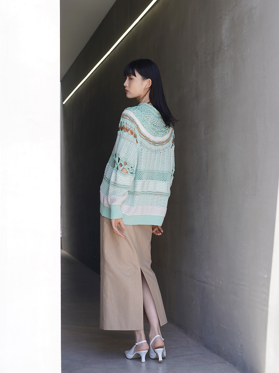 ざっくりと編まれたディテールが大胆な肌見せに見えつつ、首が詰まったネックラインが上品。