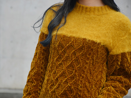 モヘアとアラン編みのドッキングであたたくおしゃれに寒さ対策ができそうです。
