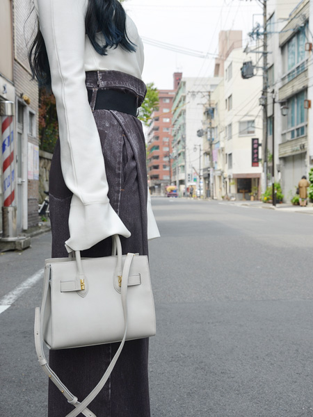 バックボタンで後ろ姿まで可憐です。こちらはブラックとゴールドに近いベージュもご用意しております。LOOKでも多用されていましたね。