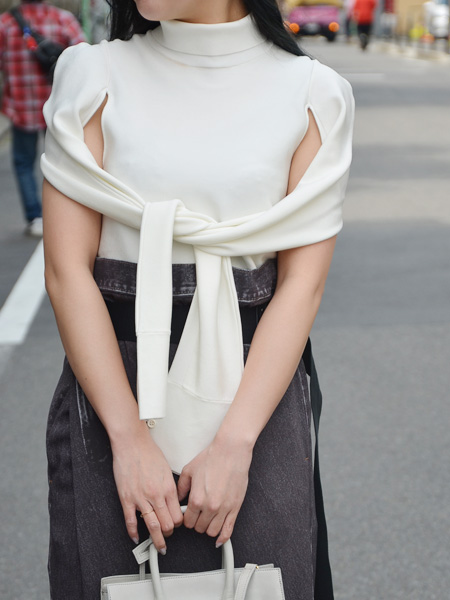 襟の部分をノーカラー風に変形したりとコーデのテイストに合わせて変形できるのが魅力的なポイント。