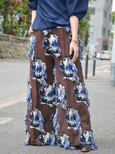 パンジーのお花が大胆に刺繍されたワイドパンツ。