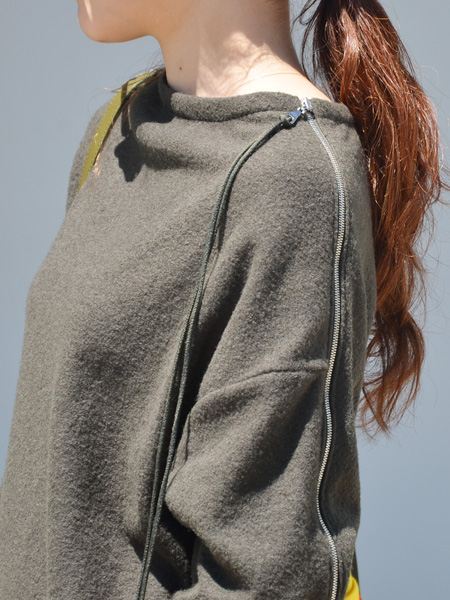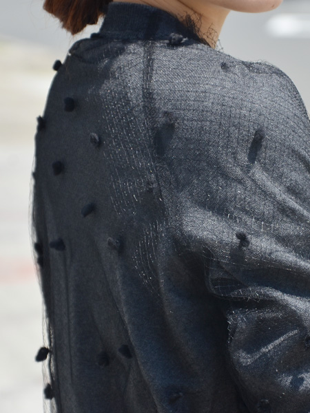 ベースとなる素材はコットンウールの伸縮性のあるカットソー素材で、その上からドット柄のチュールを重ねたMUVEILらしい遊びを感じる1着。