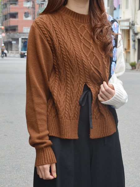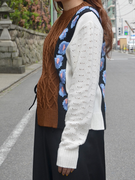 数種類の編み地を使って、AKIRANAKAといえば思い浮かぶワードのひとつ、お花柄も入れた贅沢な1着。ハイブリッドなデザインに少しレトロな雰囲気も組み合わさりたまらなく好みです。