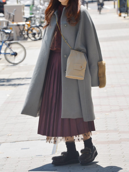 ミントグレーというグリーンがかったグレーのお色、Aラインシルエット、上品なメルトン素材、そして袖についた柔らかなファー。