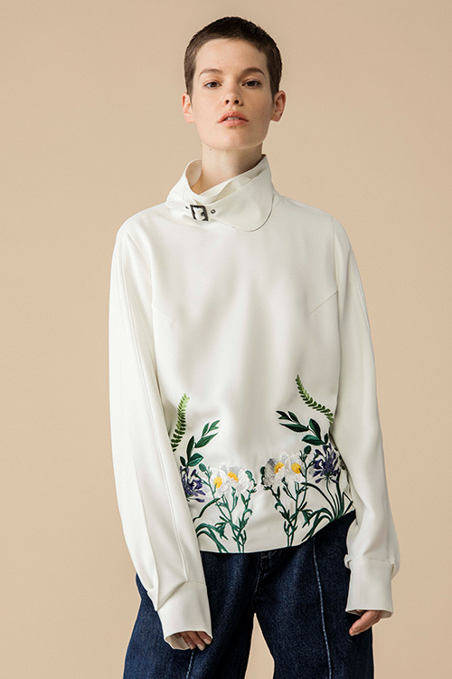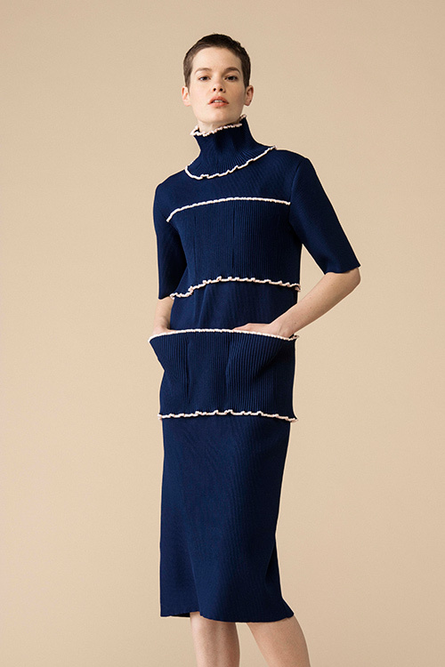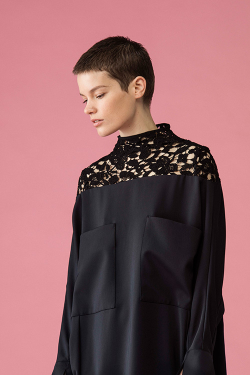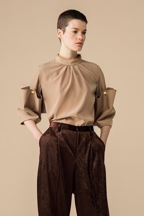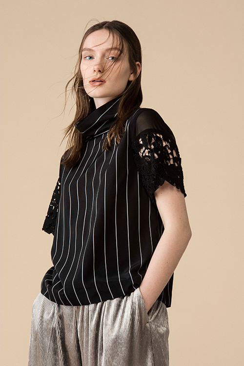 シフォンのパーピングが施されたモックネックからタックを入れた首まわりのデザイン。