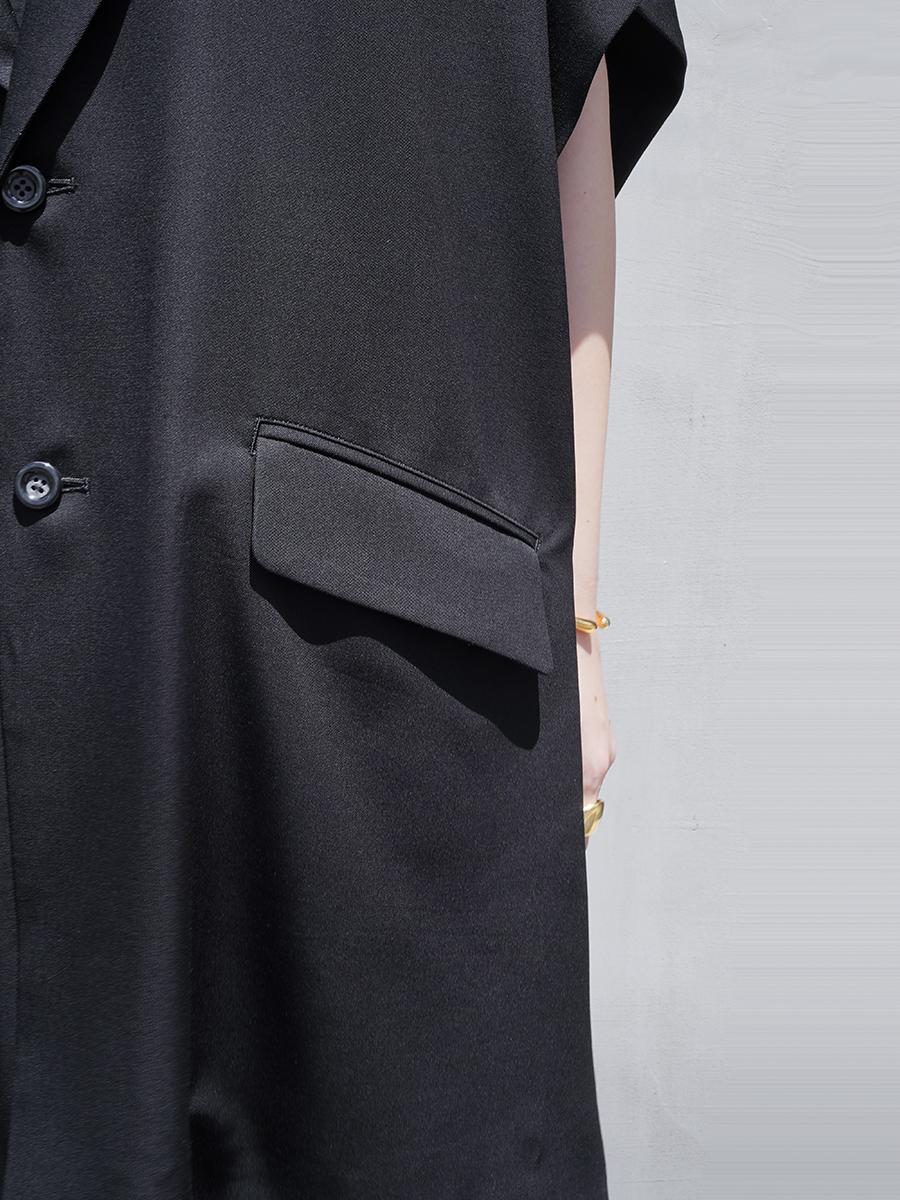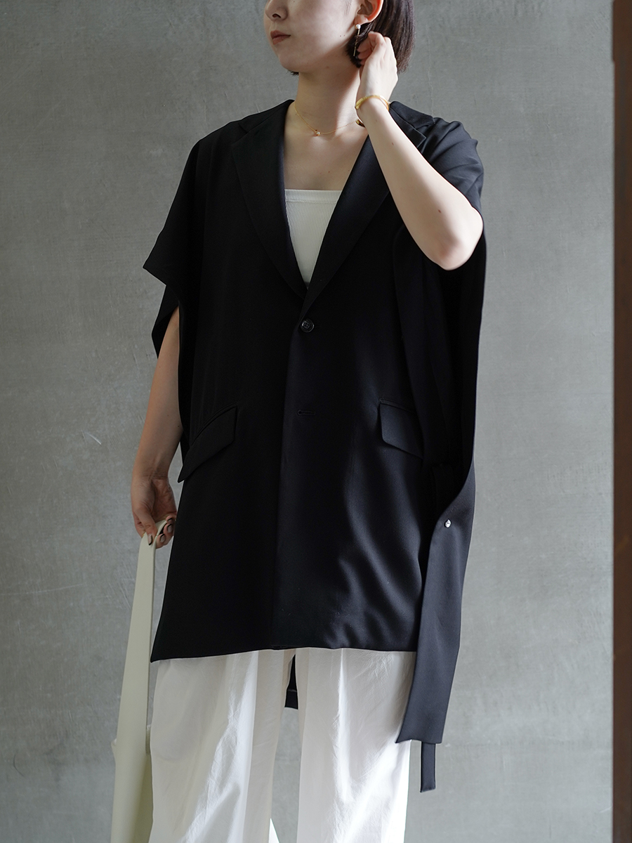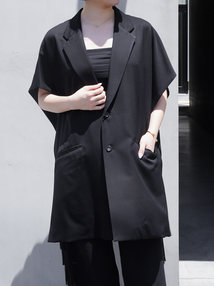 スクエア型のジャケットベストで、ゆったりとしたシルエットが特徴的なアイテム。