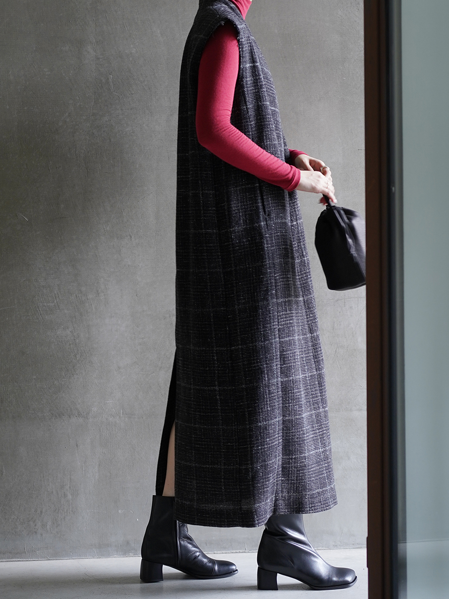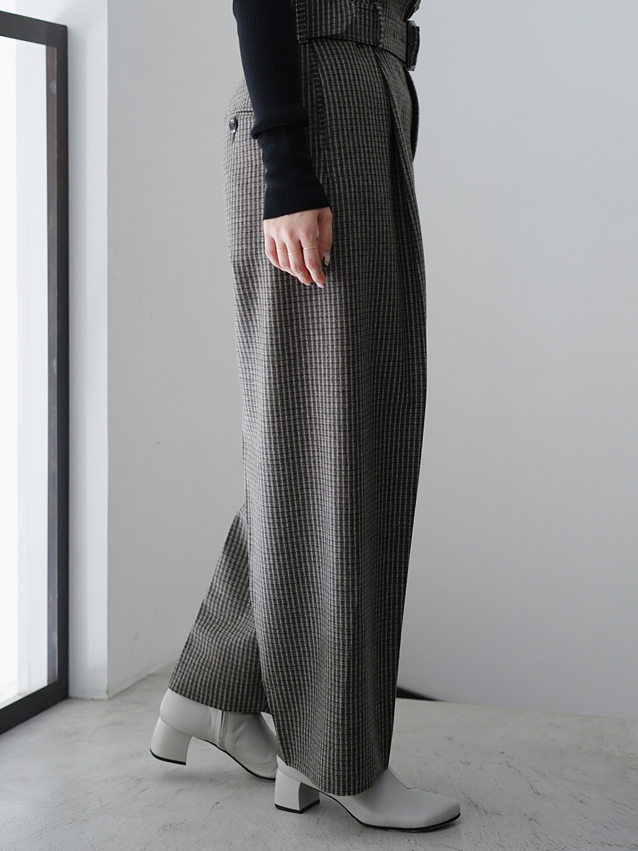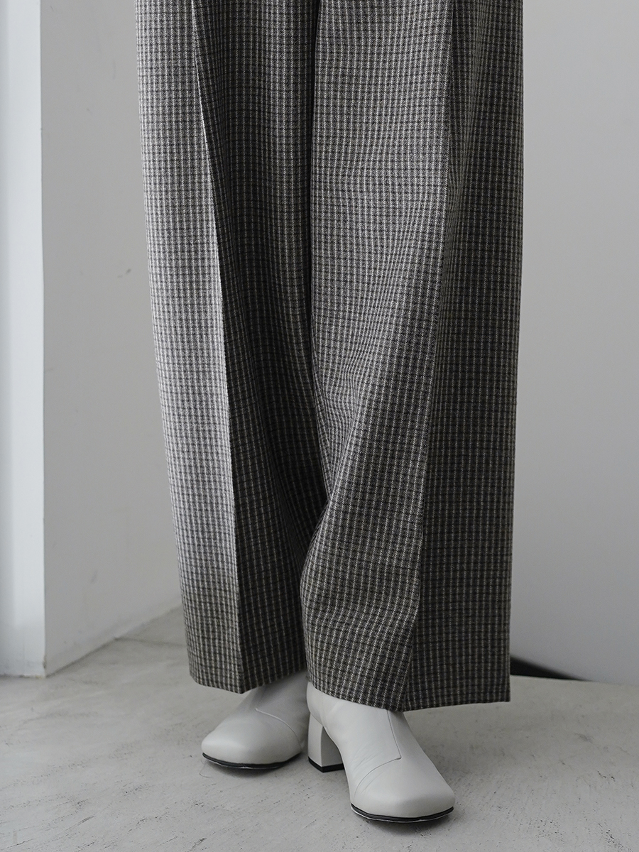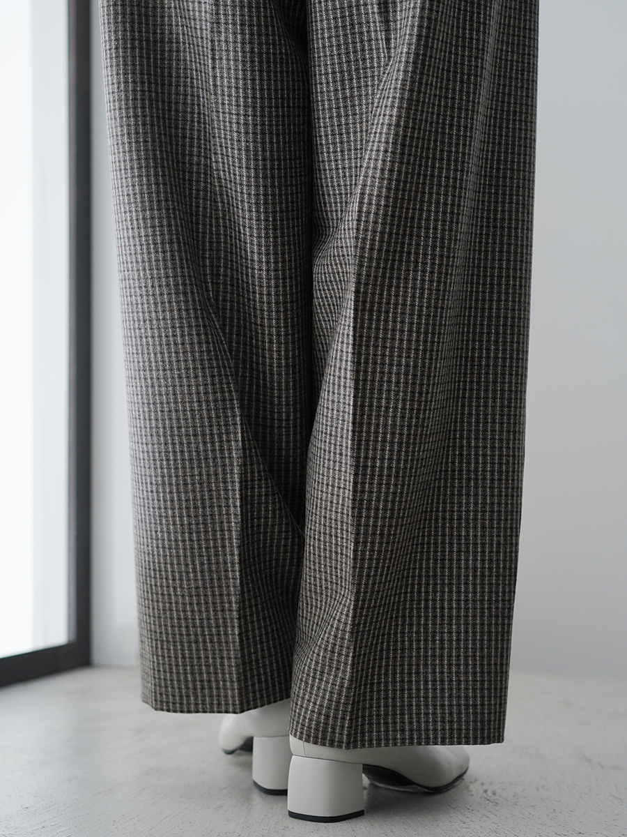チェックのパンツスタイルから覗く柔らかいカラーが、クリーンな印象を与えます。