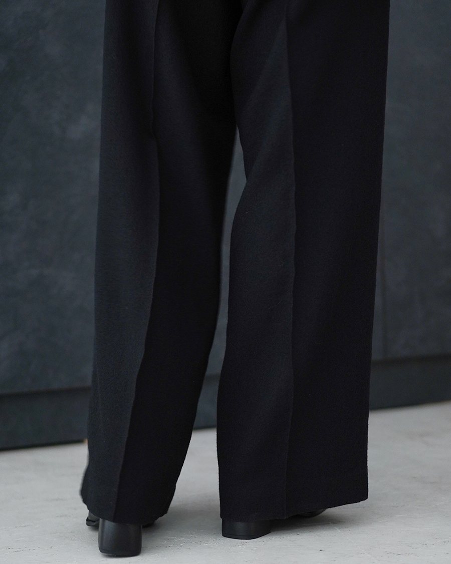 ブラックの洗練された印象が、シンプルなパンツスタイルにも映えます。
