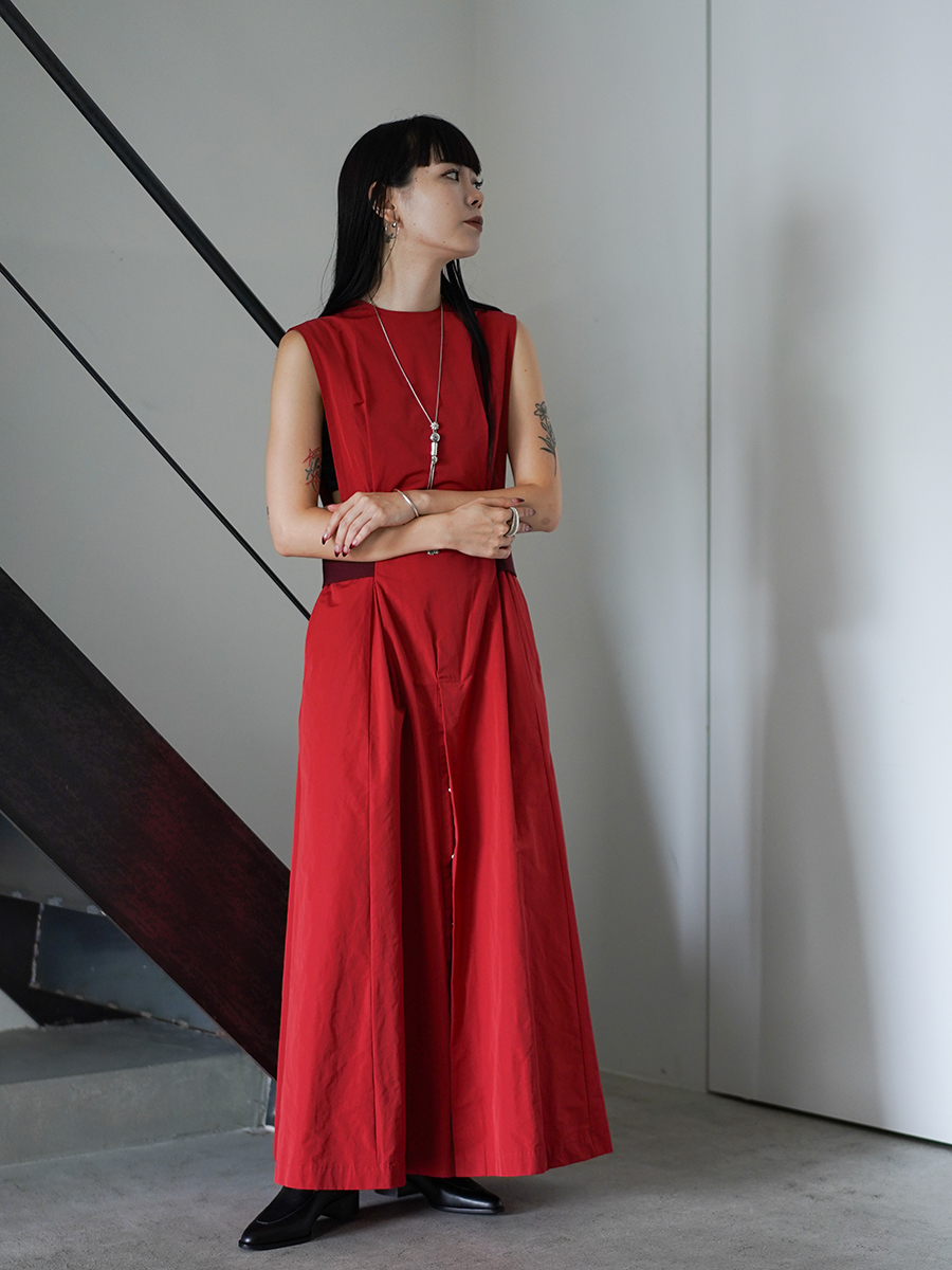 劣らない存在感で足元にボリュームが出るので女性らしいドレススタイルとハンサムなシューズとの相性か良い組み合わせです。