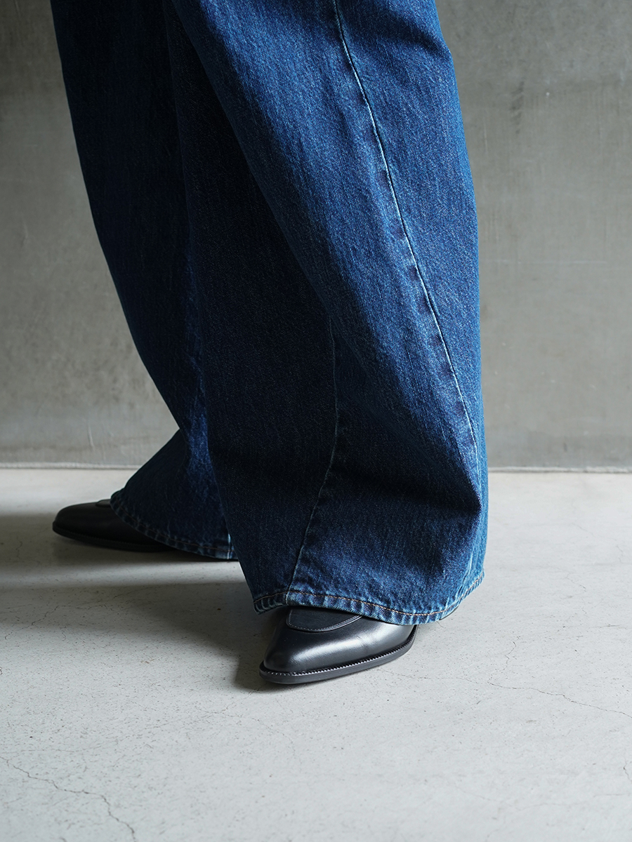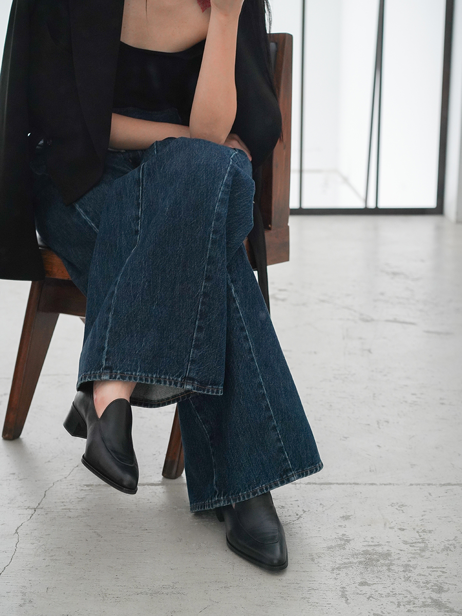 かっちりモードな印象のシューズですが、デニムアイテムと合わせてもかっこいい。