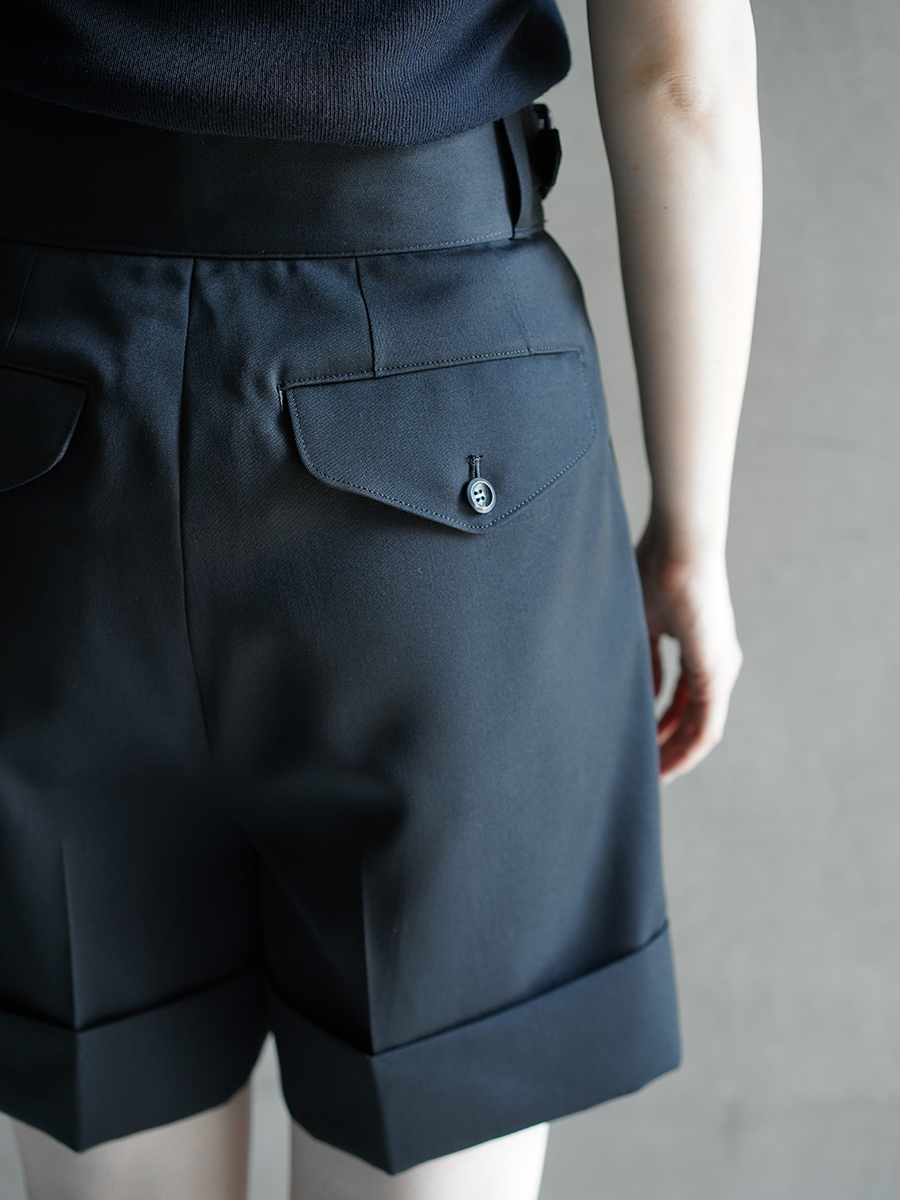 グルカパンツでは、ボリュームのある腰回りからテーパードするシルエットのバランスが魅力的なのですが、また違った雰囲気を出してくれるショーツ。