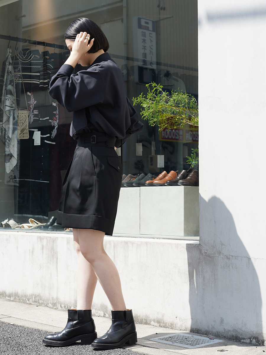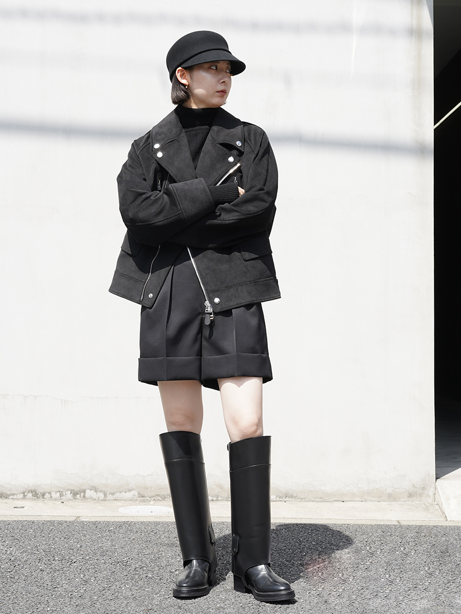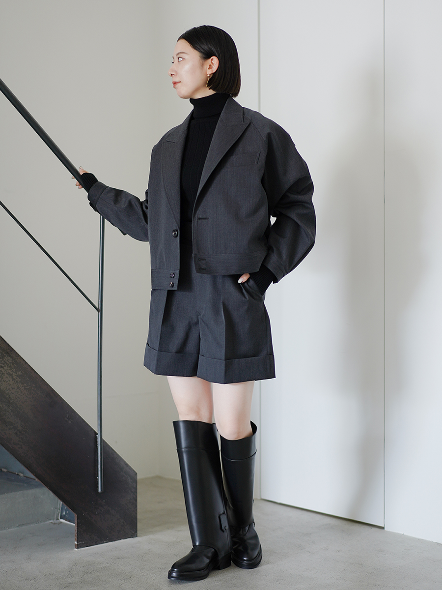 ショート丈だからこそ、フラットなシューズのみならずロングブーツなど様々なシルエットで足元を楽しんでいただけます。