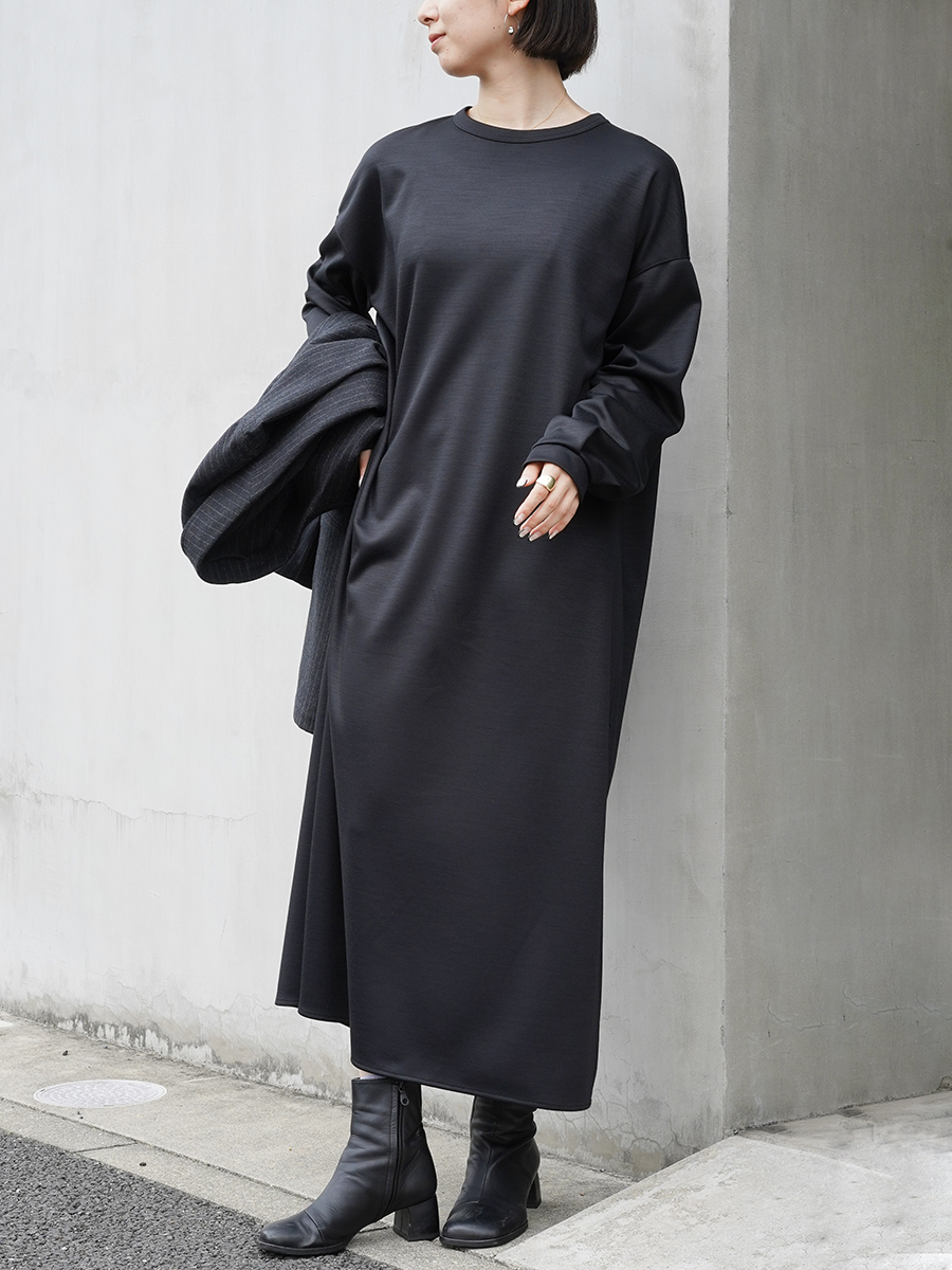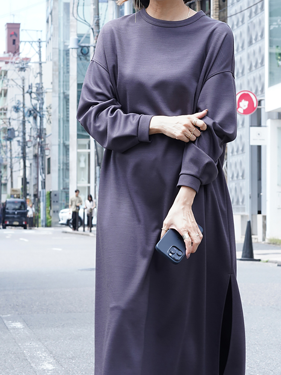 シンプルなクルーネックのドレスでここまで洗練された印象を与えてくれるものはなかなか出会いのではないかと。