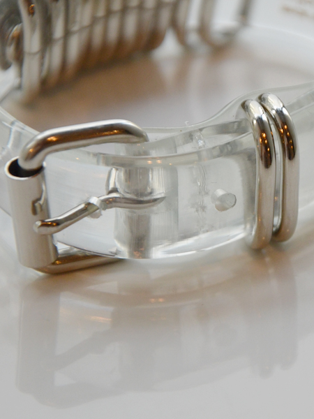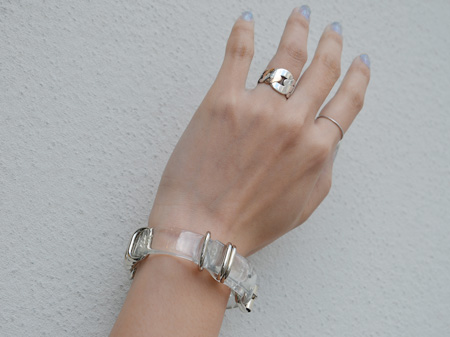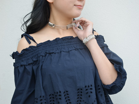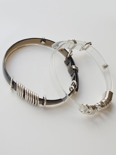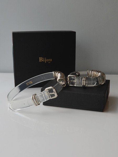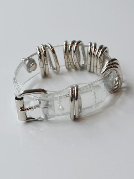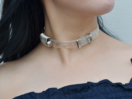 涼しげなクリアービニール素材にシルバーのバーが並んだチョーカーとブレスレット。