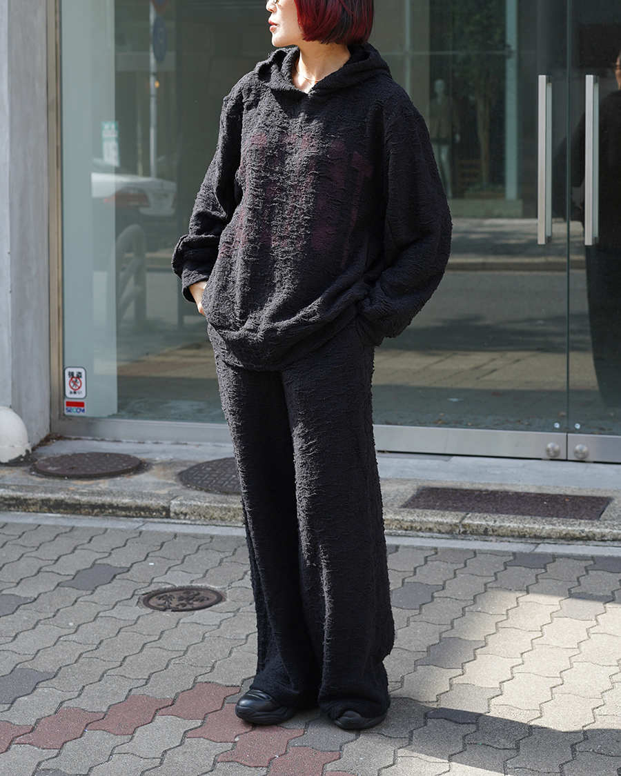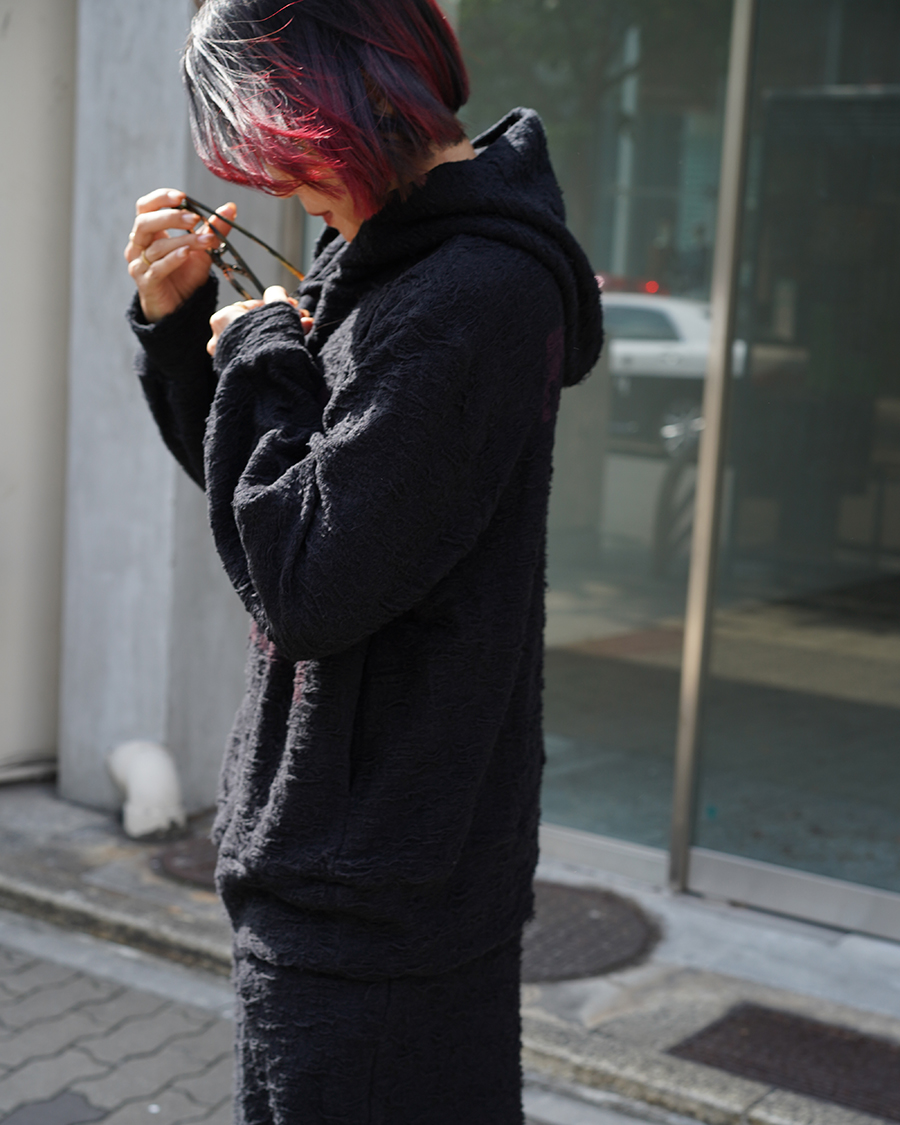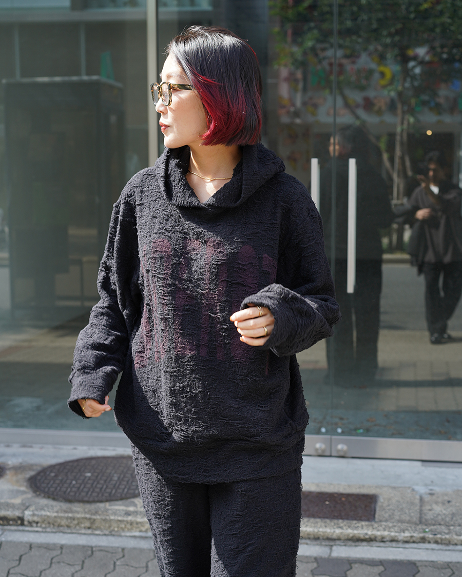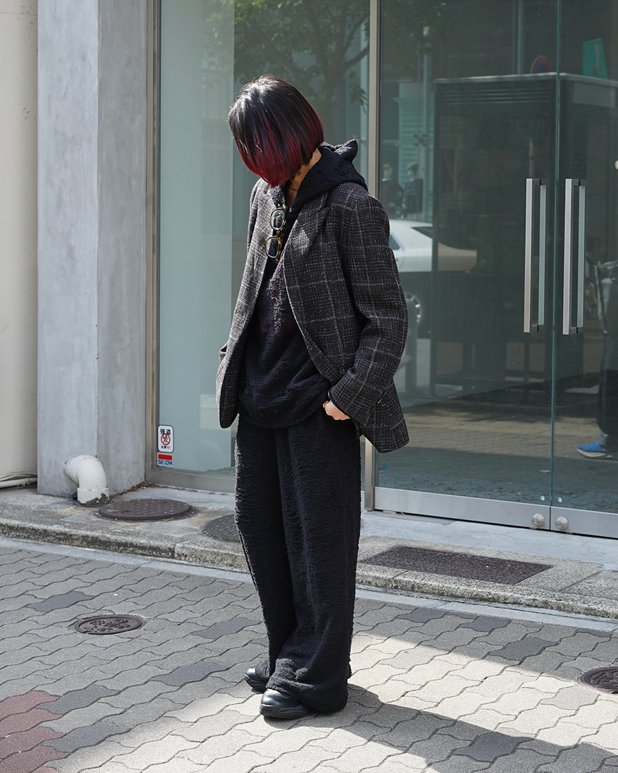 最初はてっきり、PHOTOが得意とするゆるい編み地のスウェットを引っ掻いて毛羽立たせたような素材かと思っていたんです。