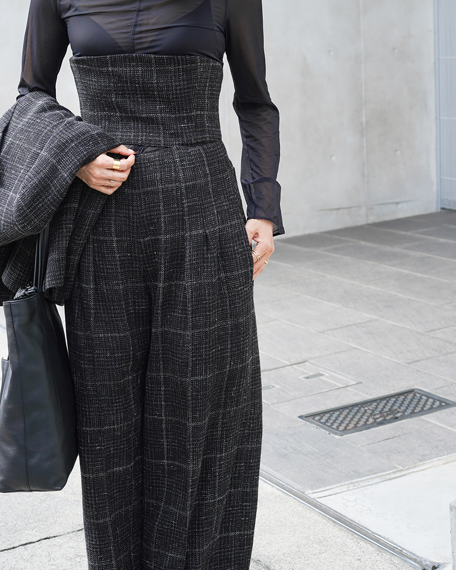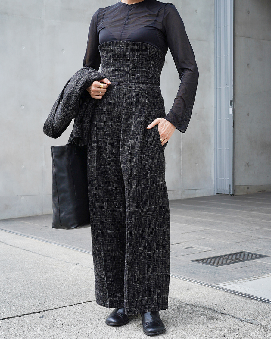 ビスチェが付いたデザインが印象的なコンビネゾンはワイドで存在感のあるシルエットのパンツに対し、ボーンの入ったビスチェはボディラインに沿うタイトなデザイン。