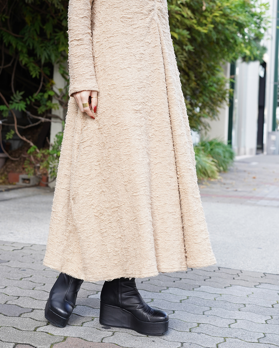 こちらはタイトなサイズ感とスカートのコクーン&フレアミックスのシルエットとなっています。