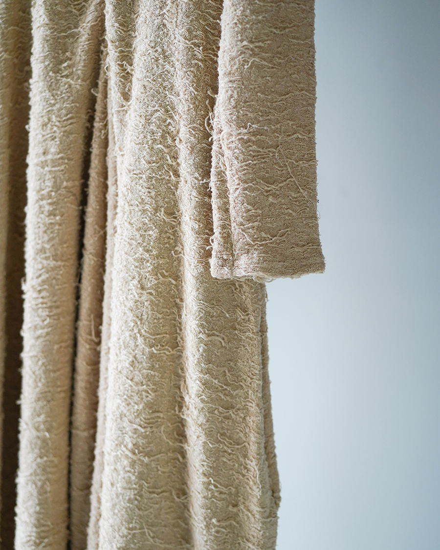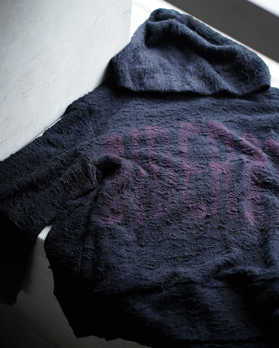 スウェット素材を引っ掻いて毛羽立たせたような独特の風合いの素材。