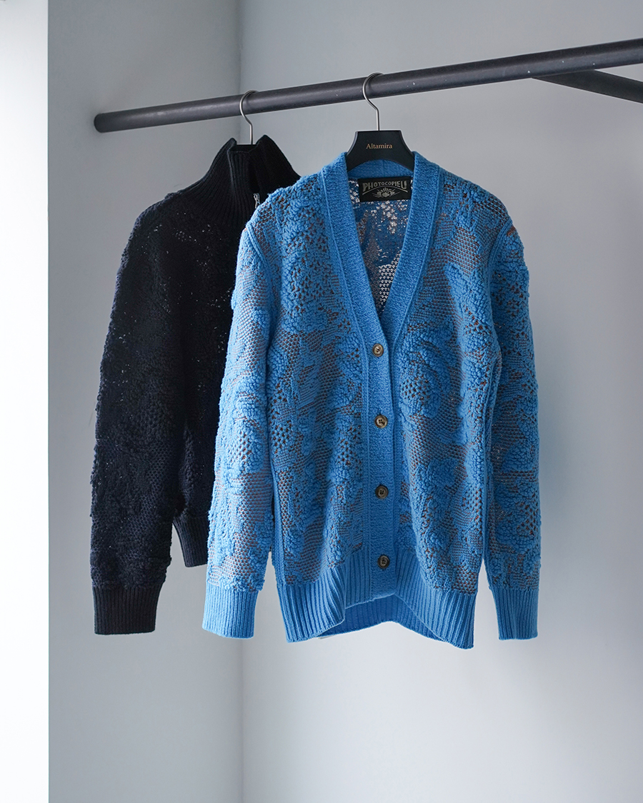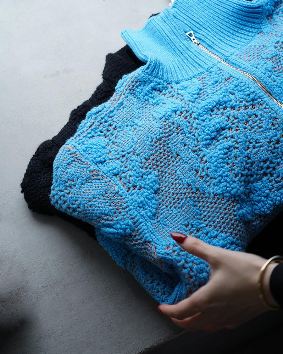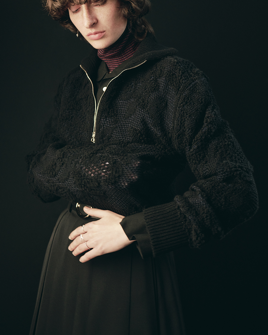 ジャガードでレースを表現したハーフジップニット。
