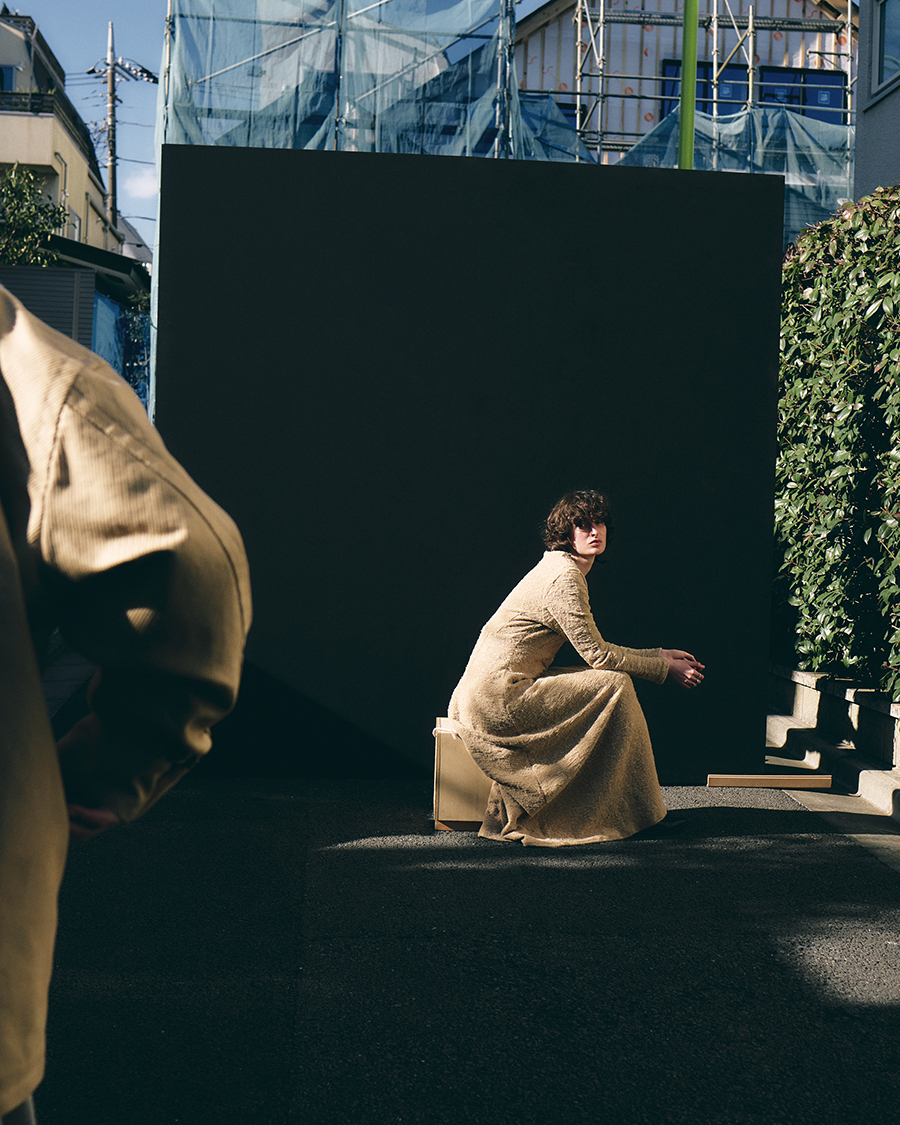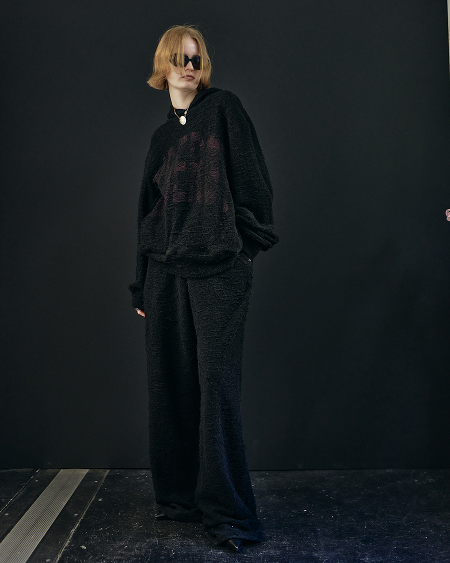 コクーンのような丸みを帯びたシルエットが印象的なドレスとプリントが施されたフーディ。