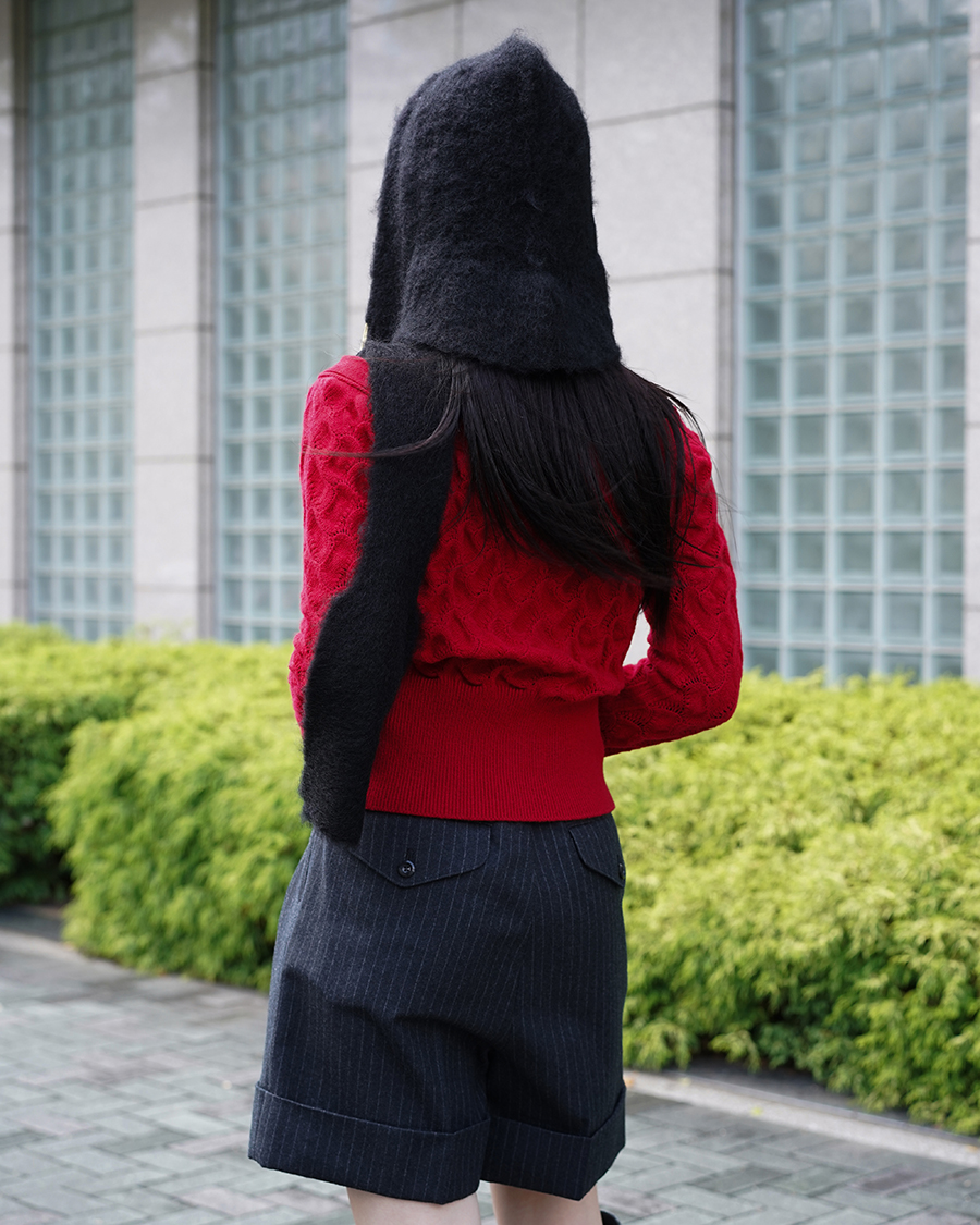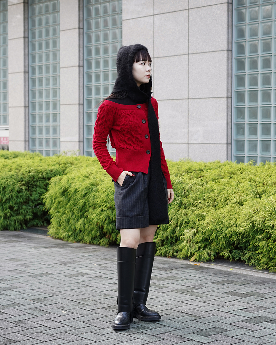 ニットの赤を目立たせるため他のアイテムは落ち着いたトーンに。