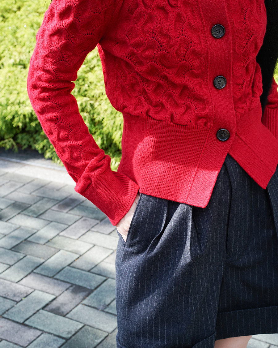 この極細のウールを立体的な透かし柄で編み上げることで光に当たると陰影が浮かび上がり、素材の上質さも感じます。
