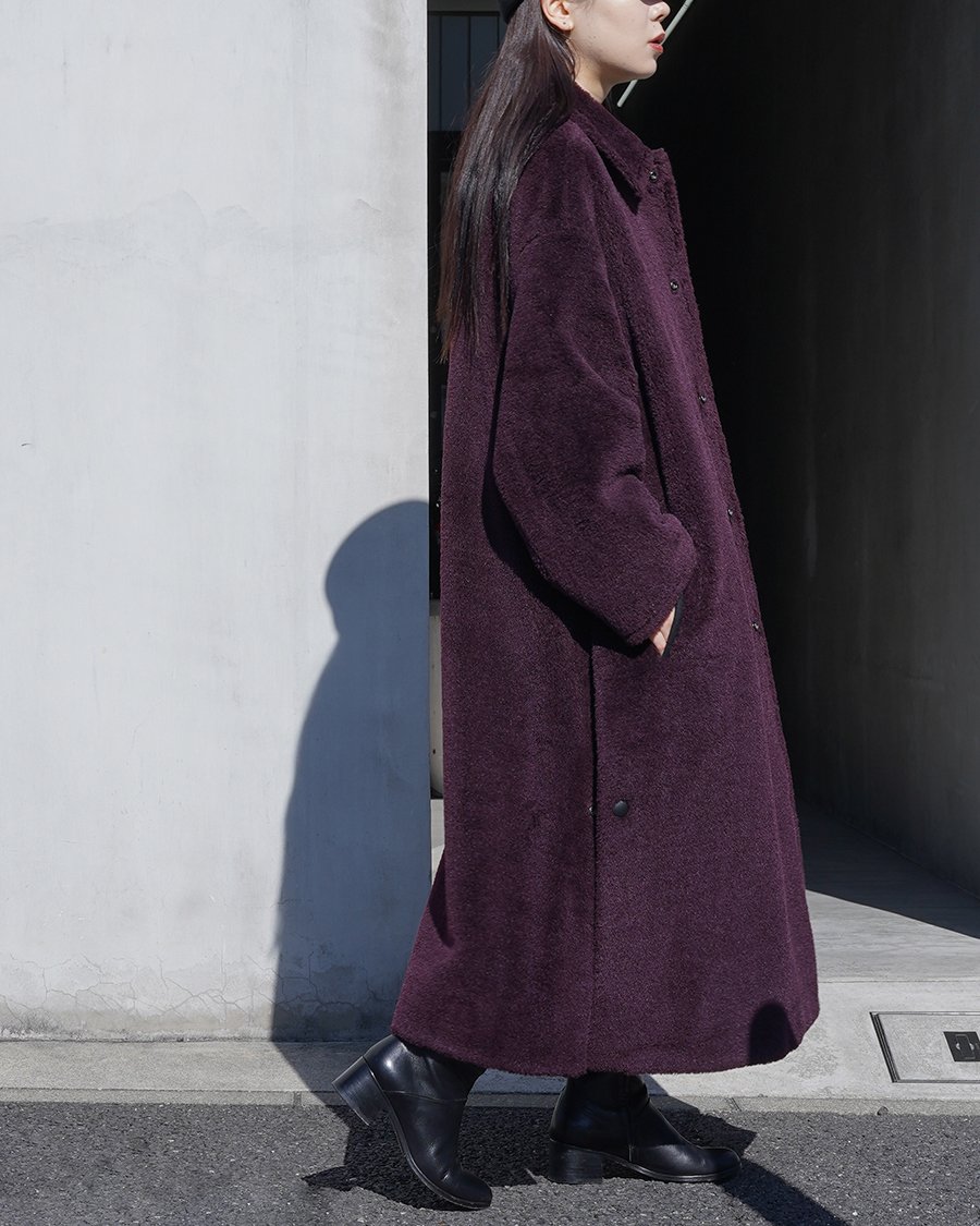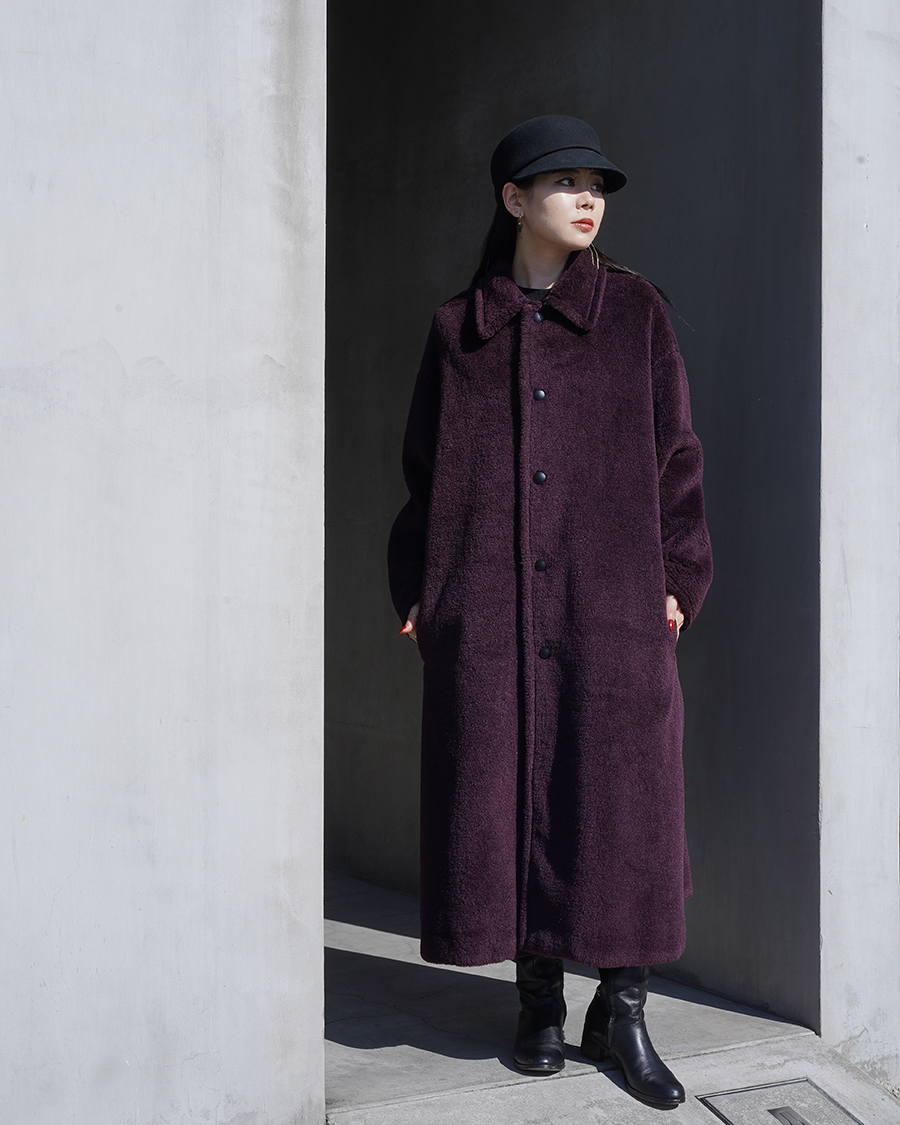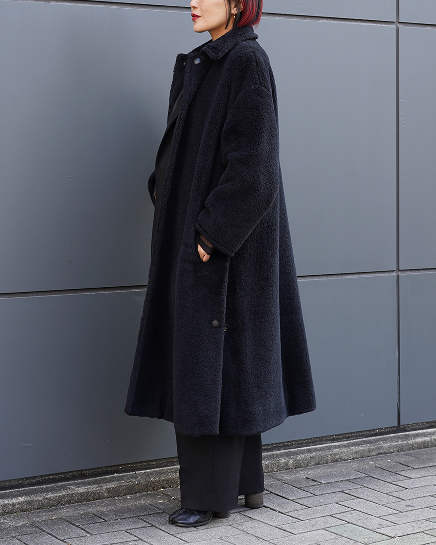 今回の別注企画で作らせていただいたウールシルクボアのロングバージョンでバルカラーコートがベースとなったもの。