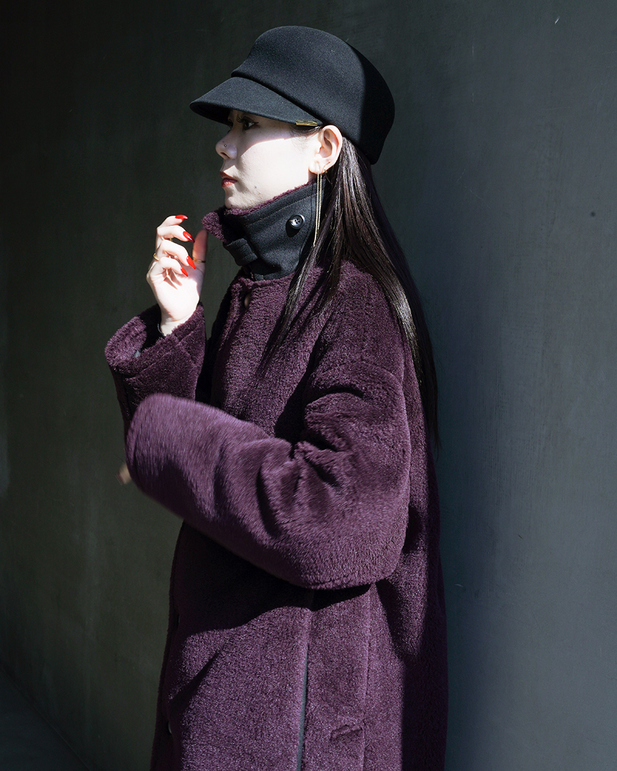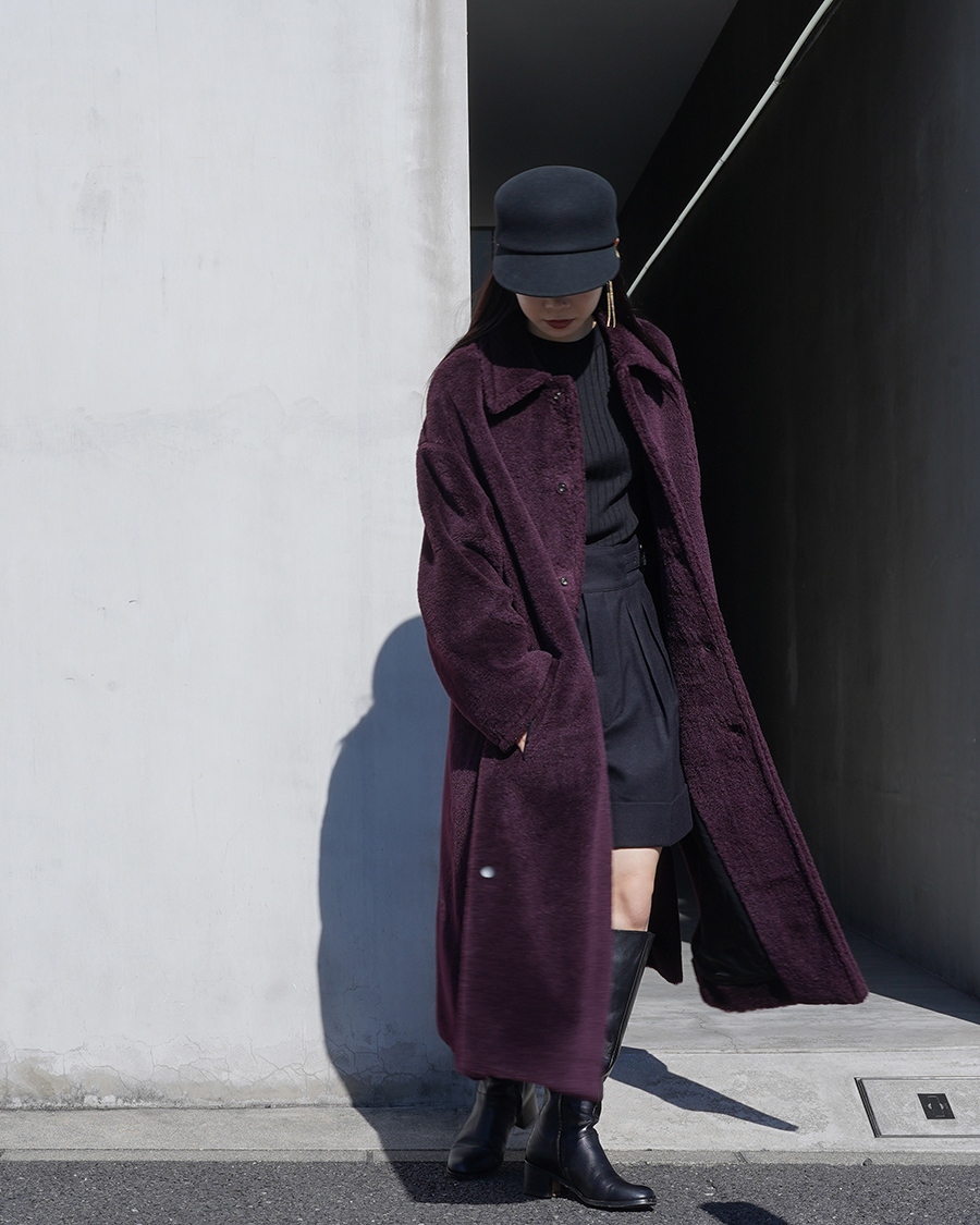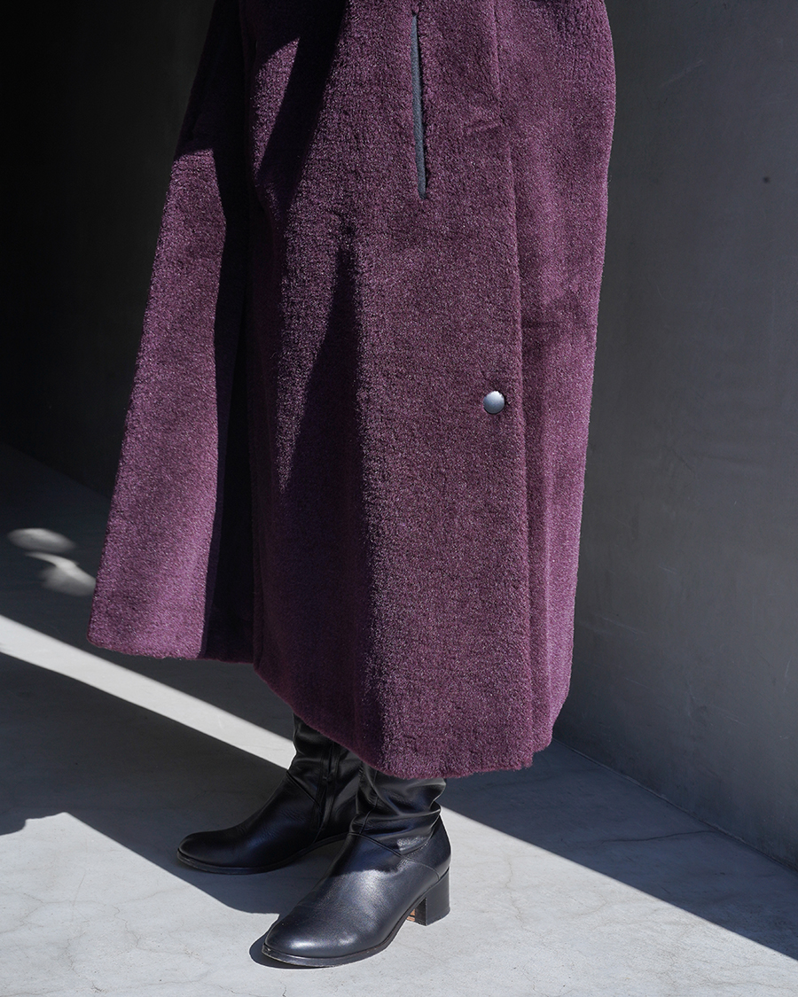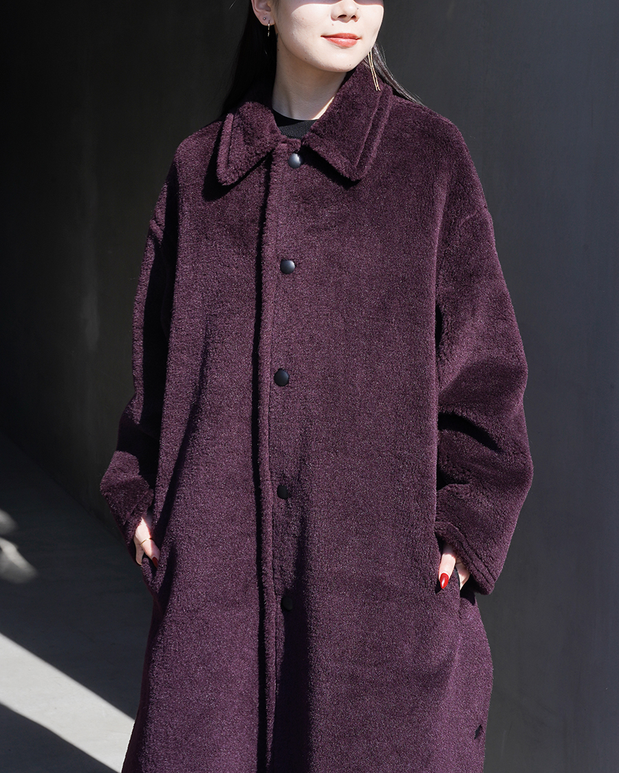 今回の別注企画で作らせていただいたウールシルクボアのロングバージョンでバルカラーコートがベースとなったもの。