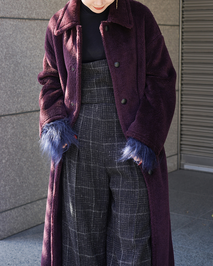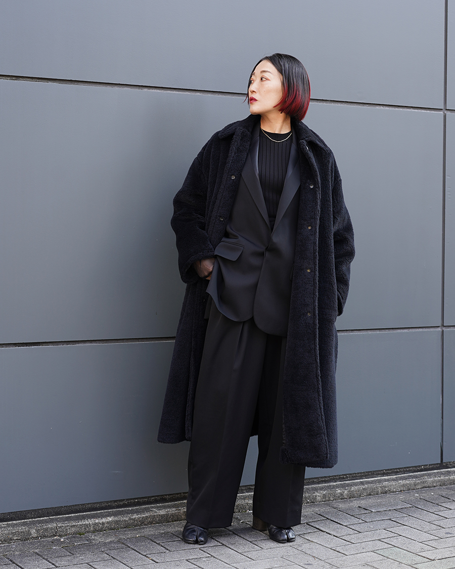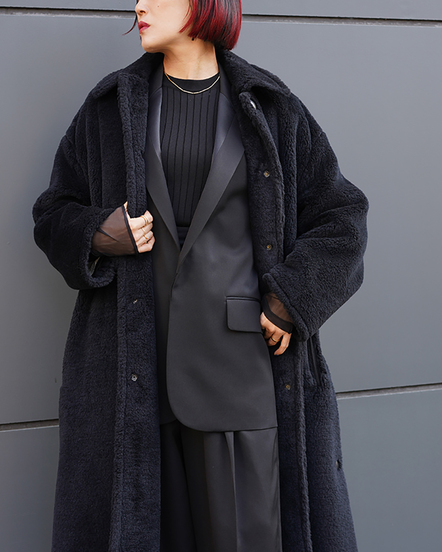 ばさっとエレガントに大人モードスタイル。ボアの高級感のある生地がより一層引き立つスタイリングです。