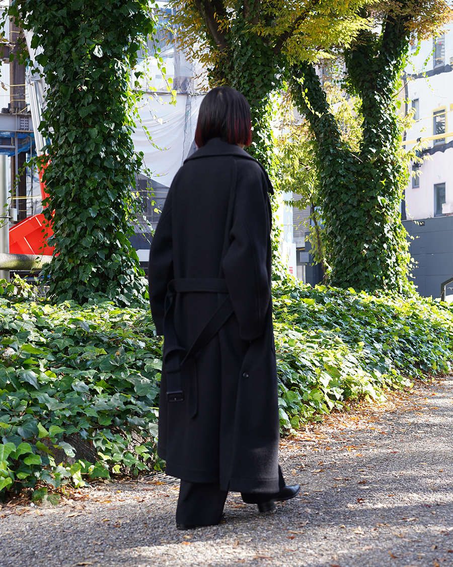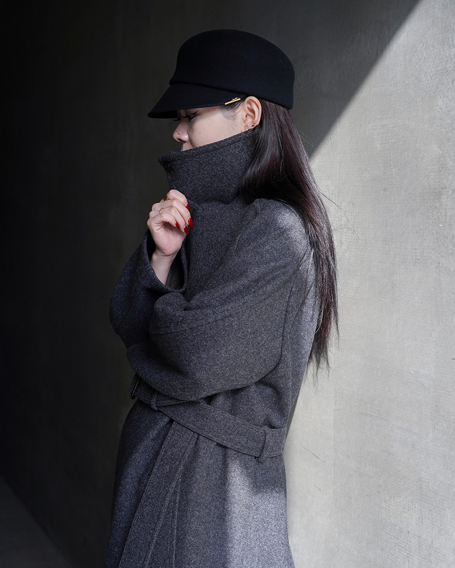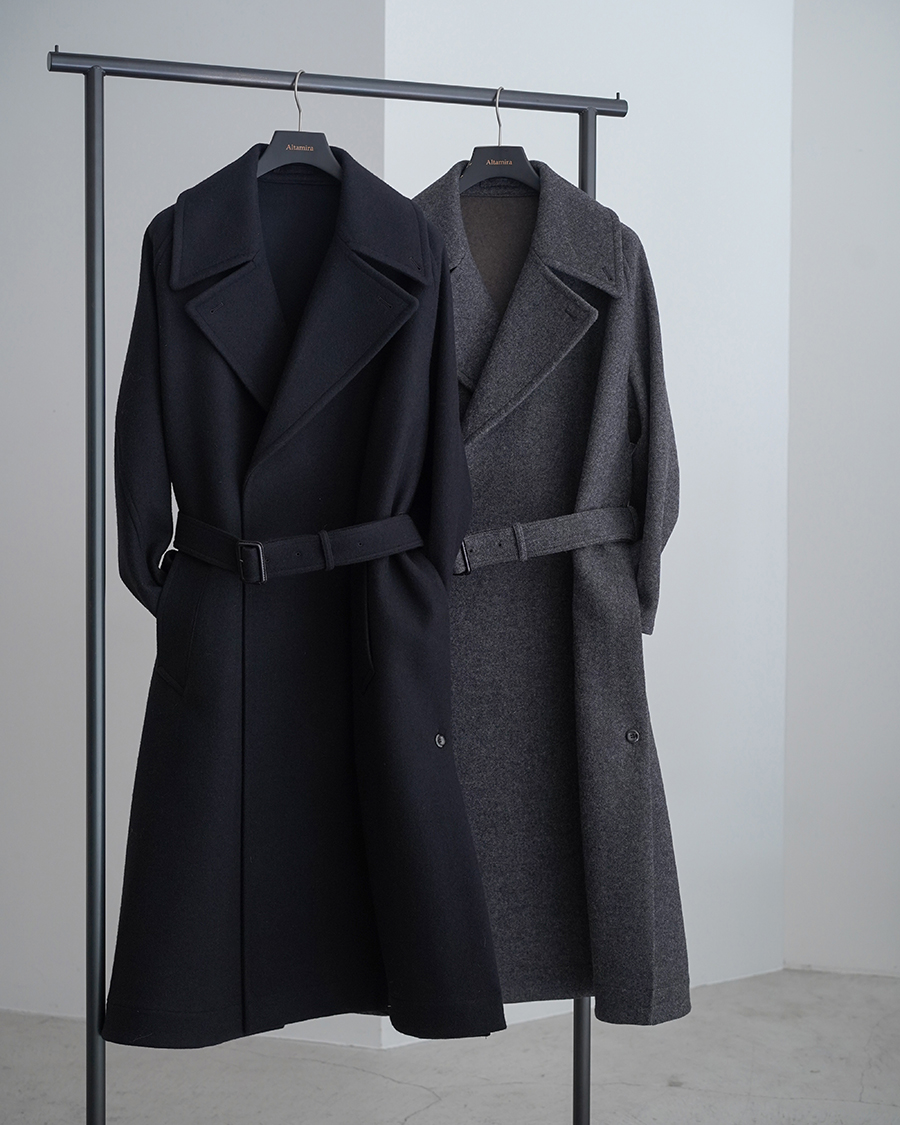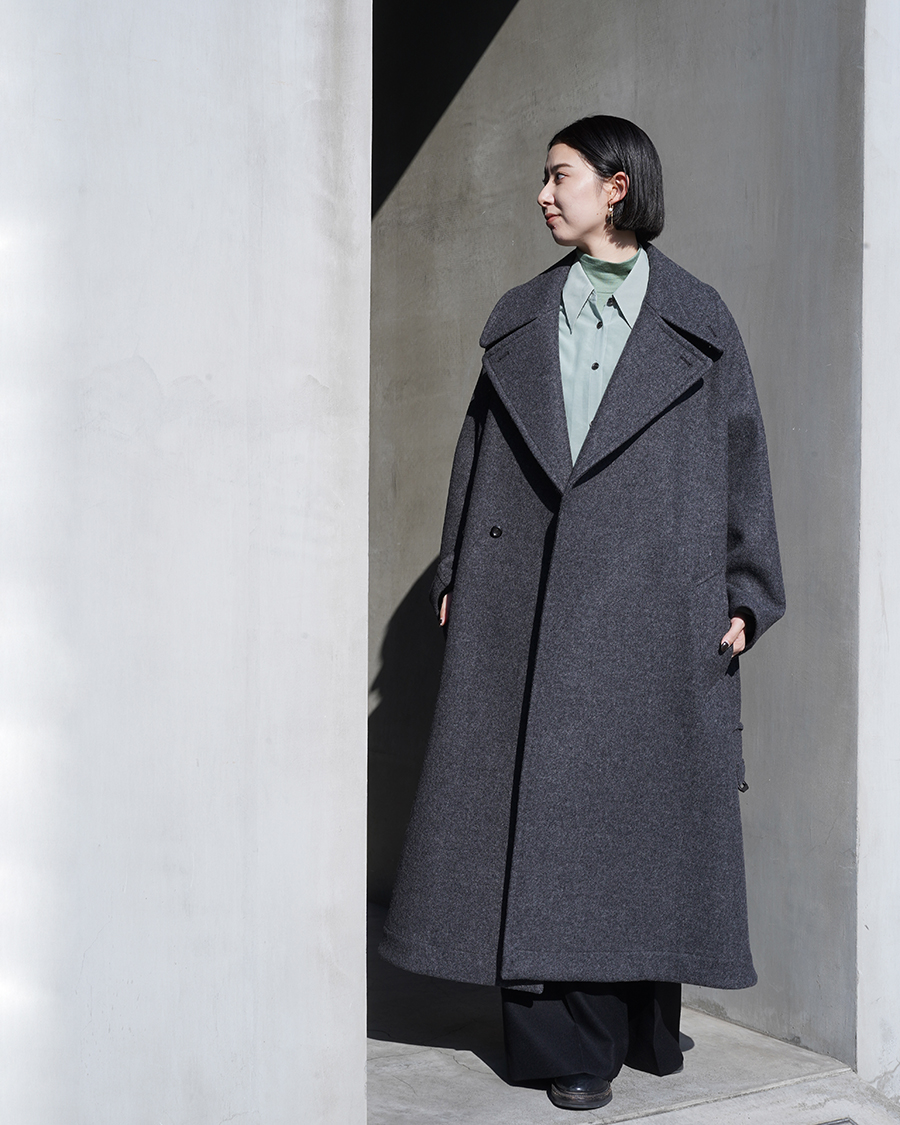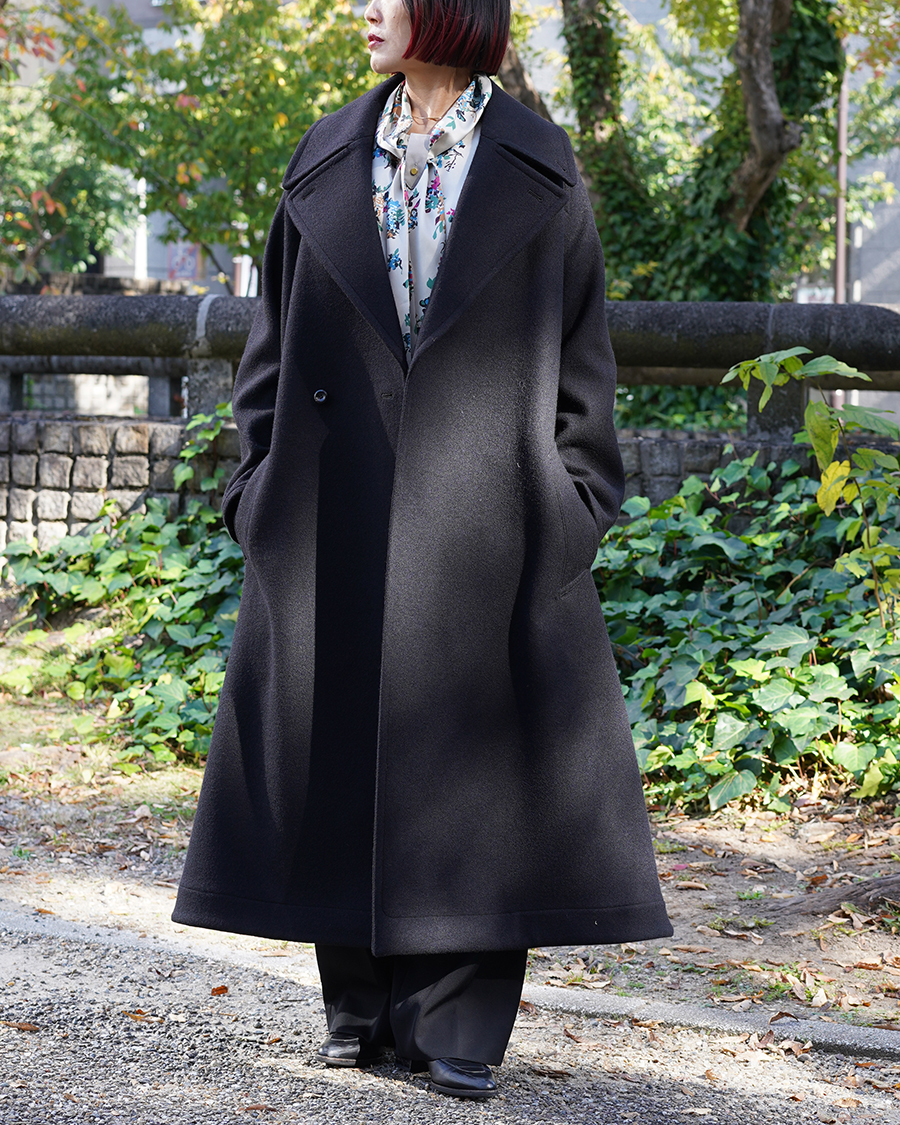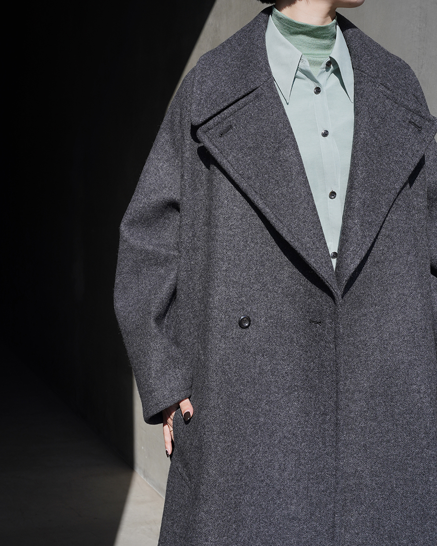 特徴的なディテールは設けず、派手さは無くともクラス感を演出してくれるこのコートは、優雅な襟のバランス、ダブルブレストのクラシカルな面持ちに、シワーつない凛とした美しいシルエットが最大の魅力です。