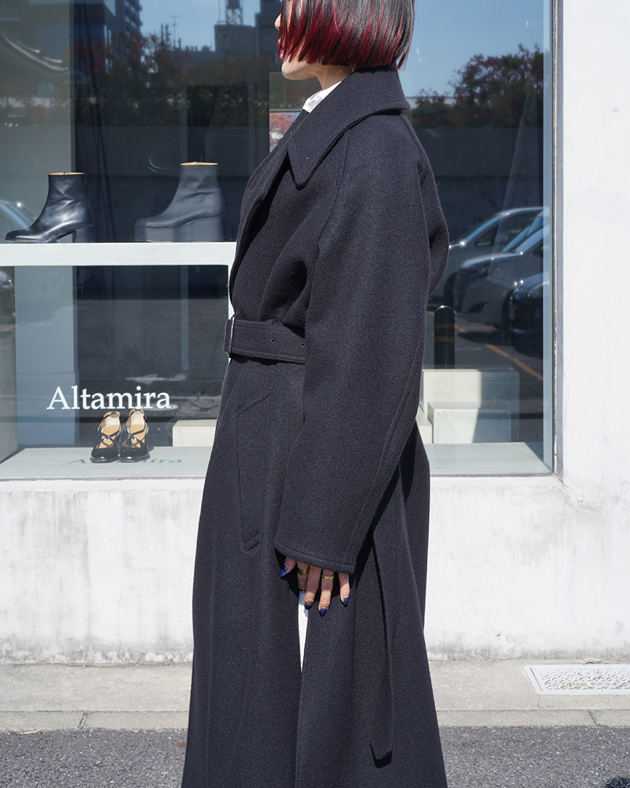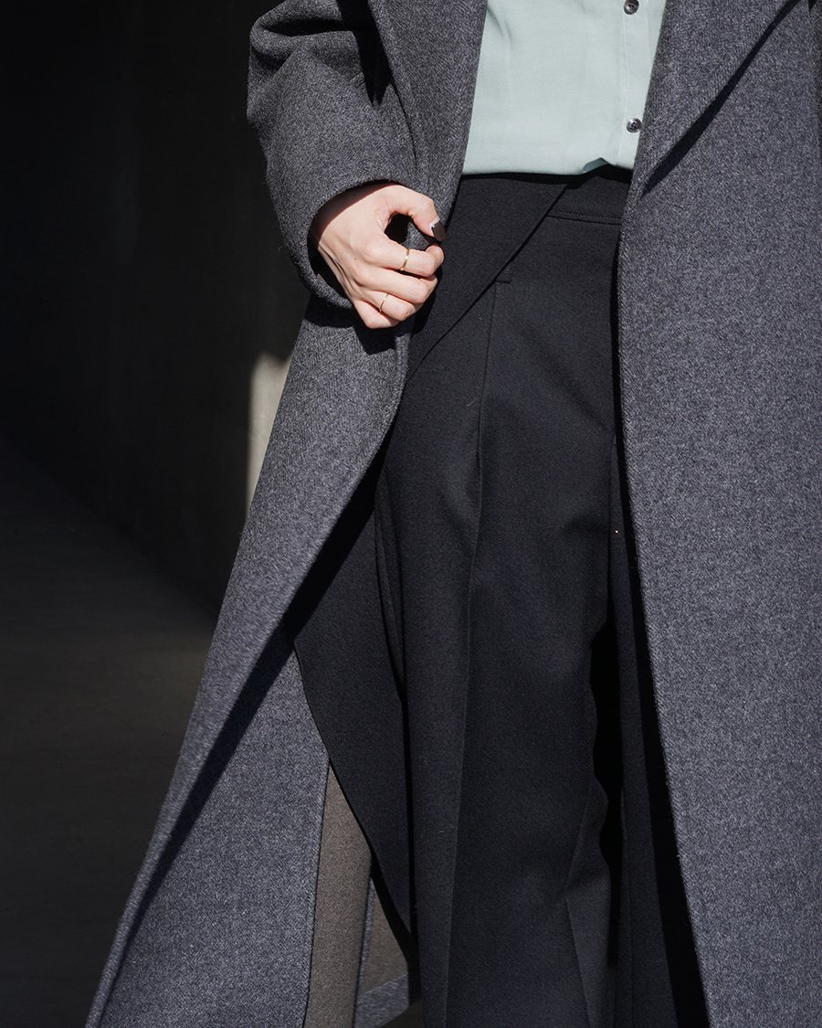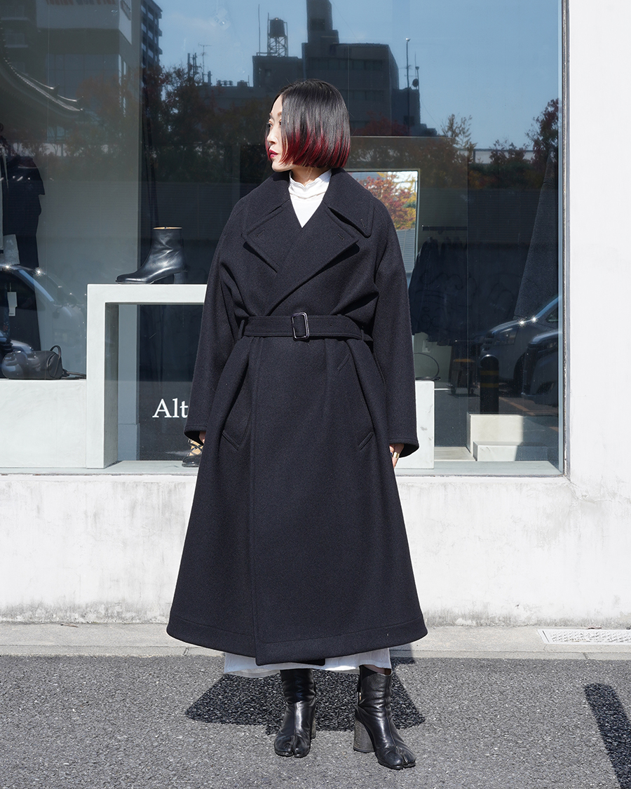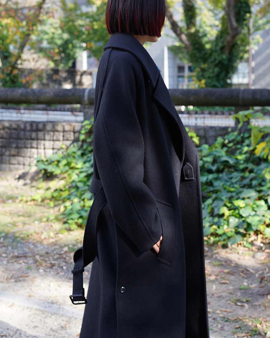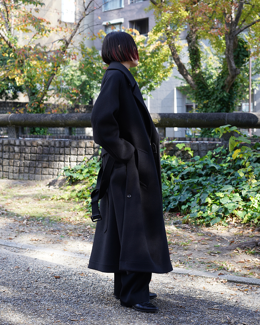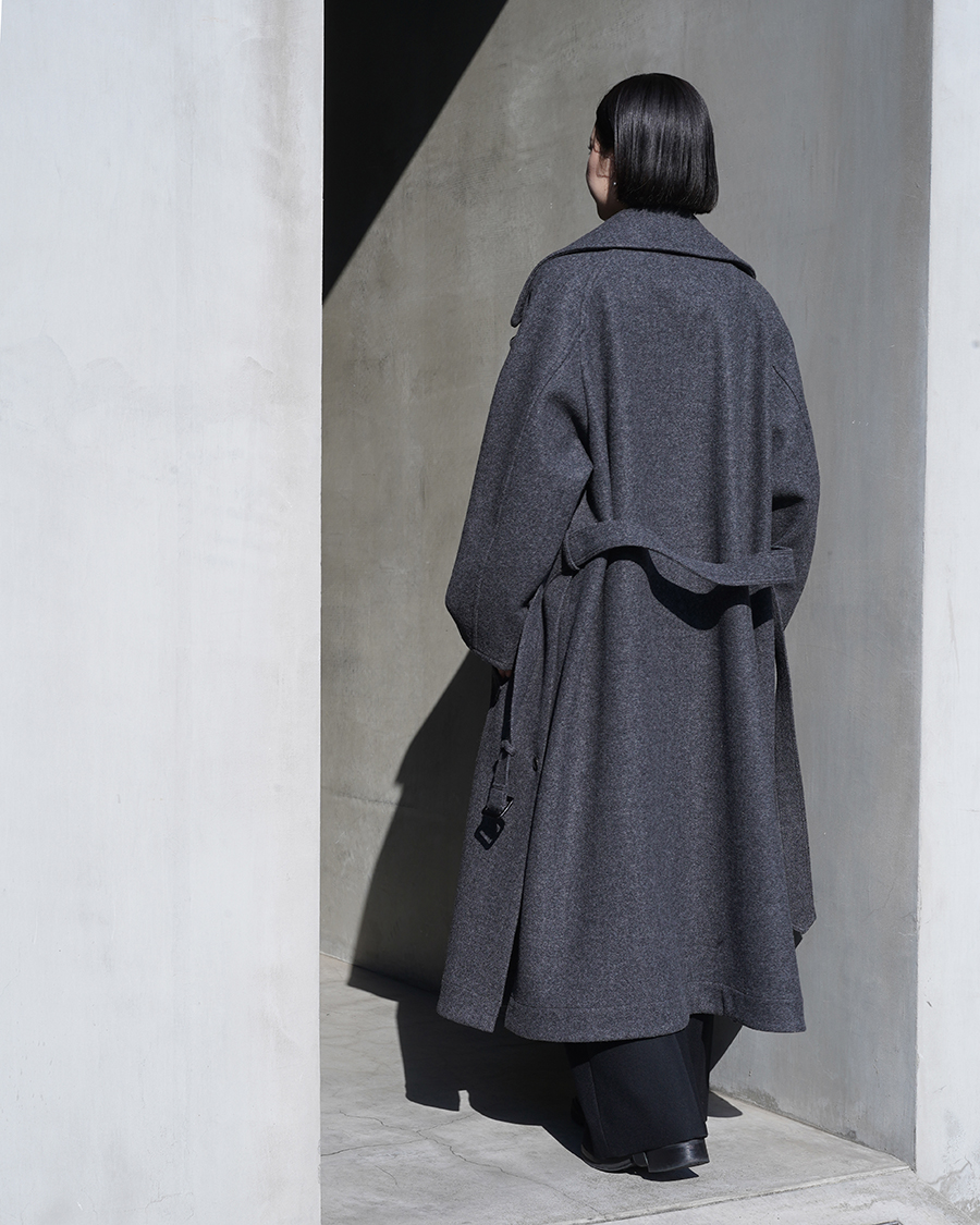 特徴的なディテールは設けず、派手さは無くともクラス感を演出してくれるこのコートは、優雅な襟のバランス、ダブルブレストのクラシカルな面持ちに、シワーつない凛とした美しいシルエットが最大の魅力です。