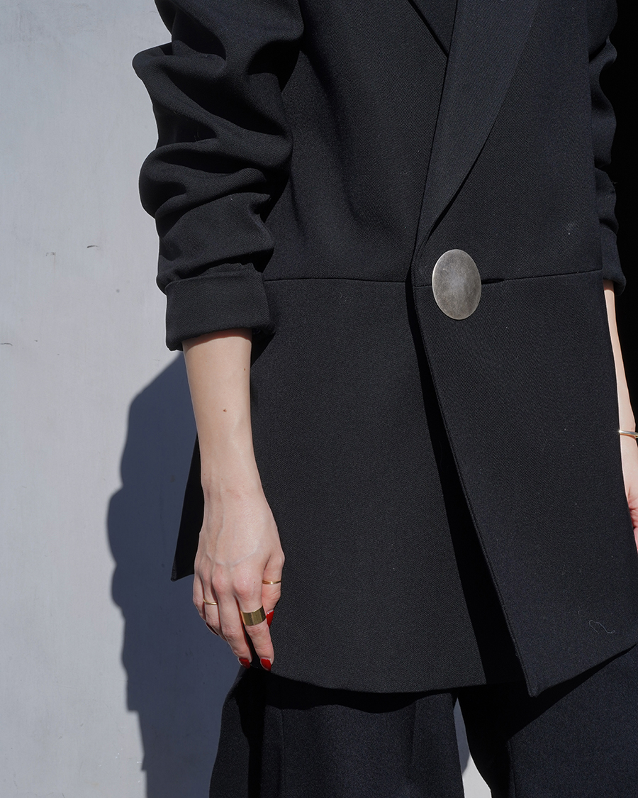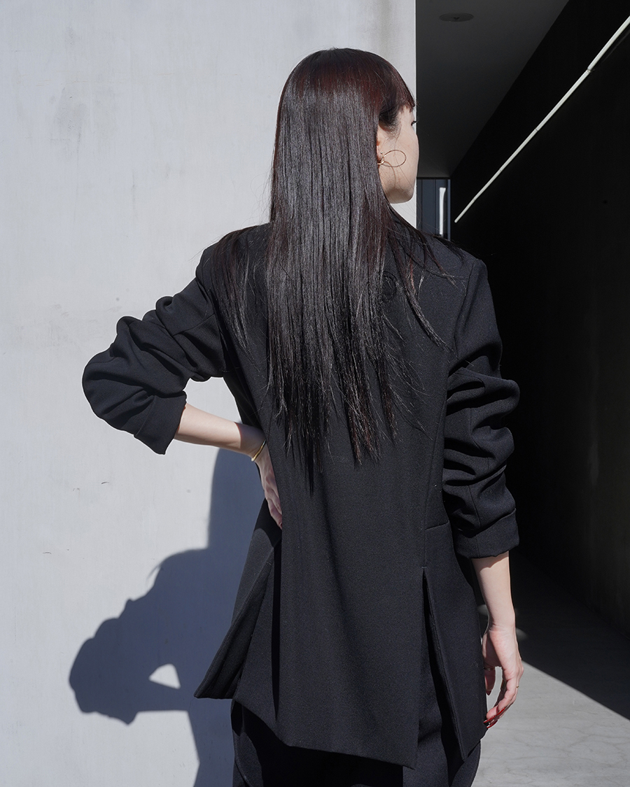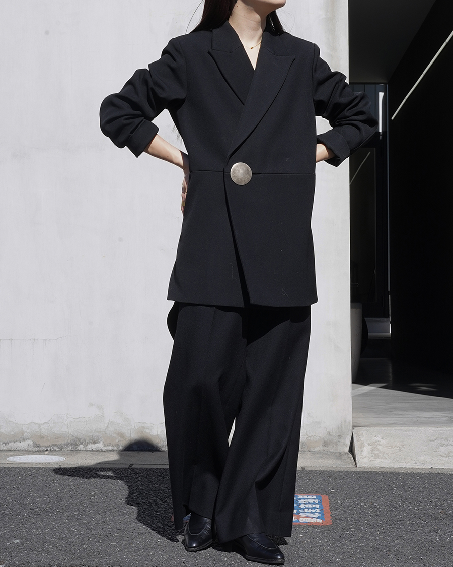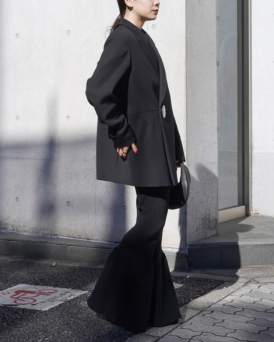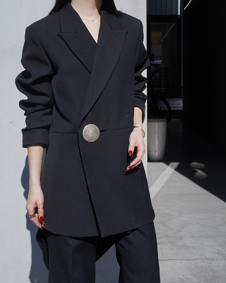 クラシックなテーラードラインにシャープな肩ライン、少しオーバーなサイジングのボックスシルエットで体に程よくゆとりが生まれます。