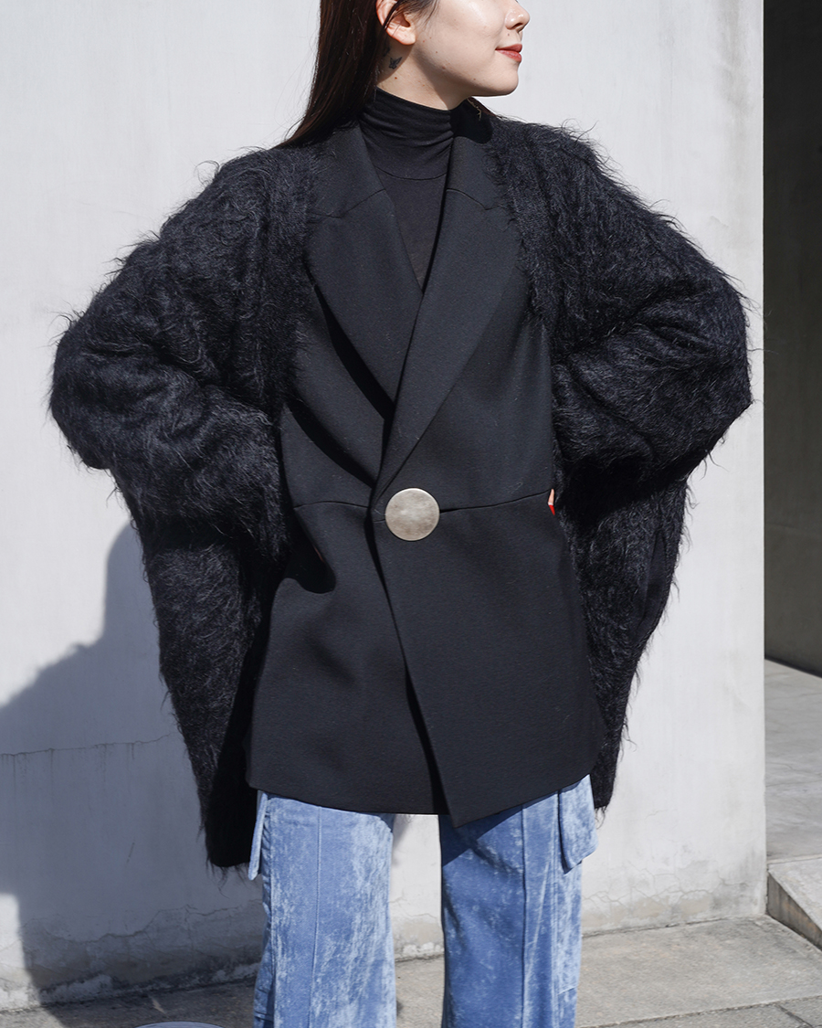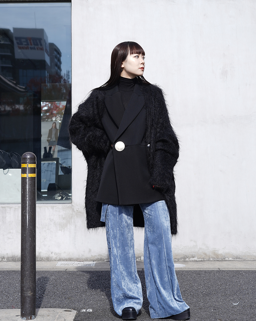 モヘアにベロアを組み合わせた冬らしいスタイリング。