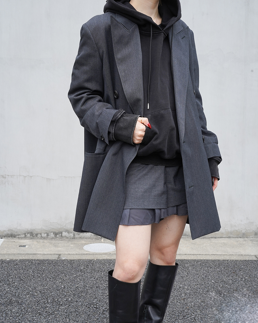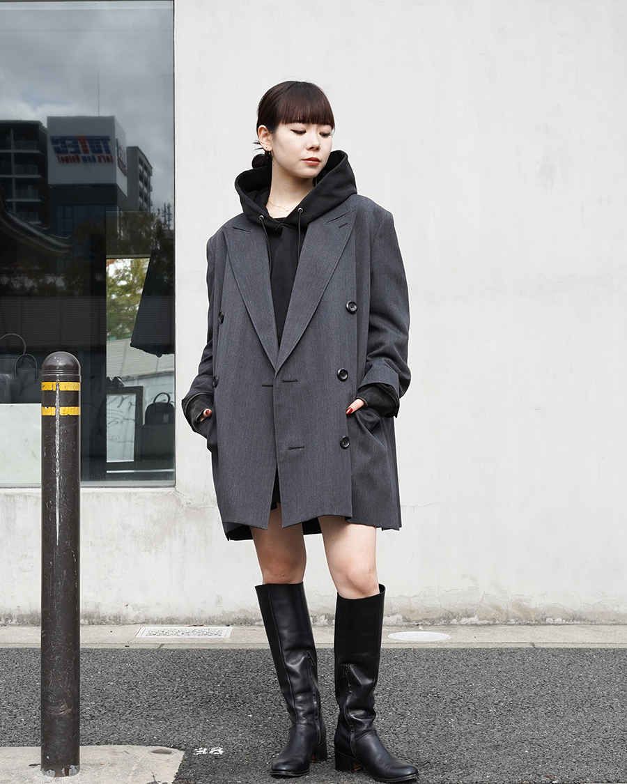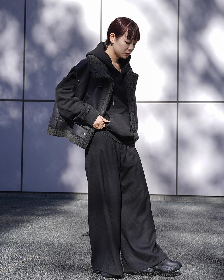 オーバーなサイジングのシルエットなのでボトムスをタイトにすることですっきりとしたバランス感に。