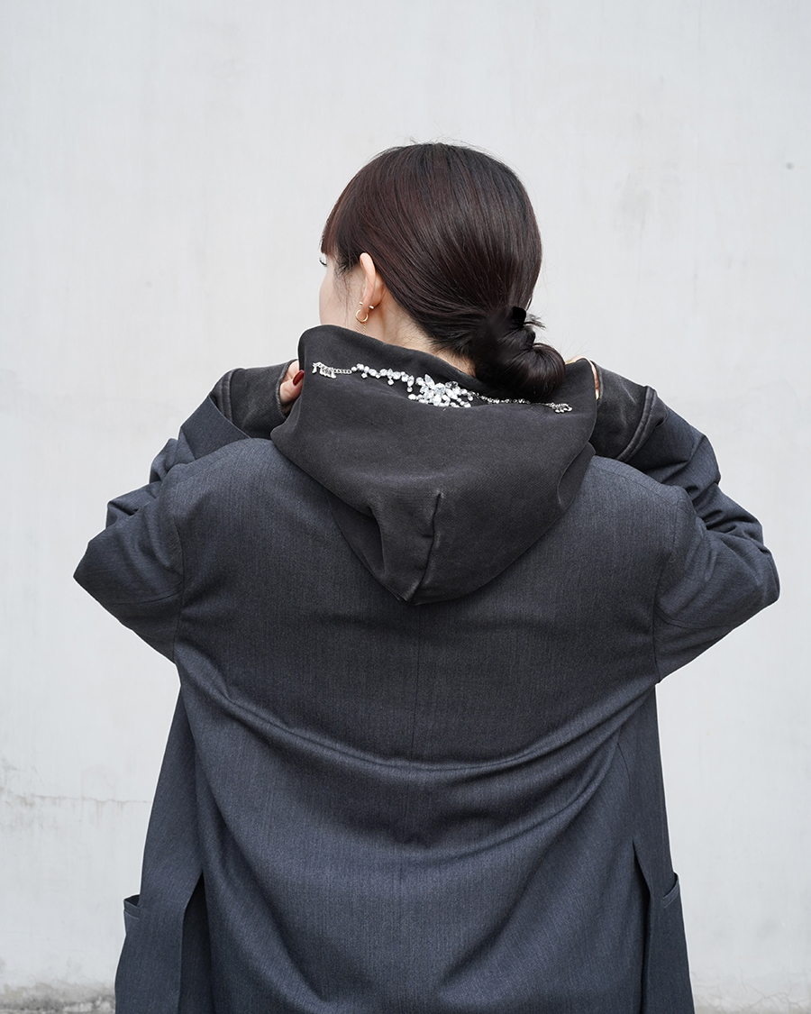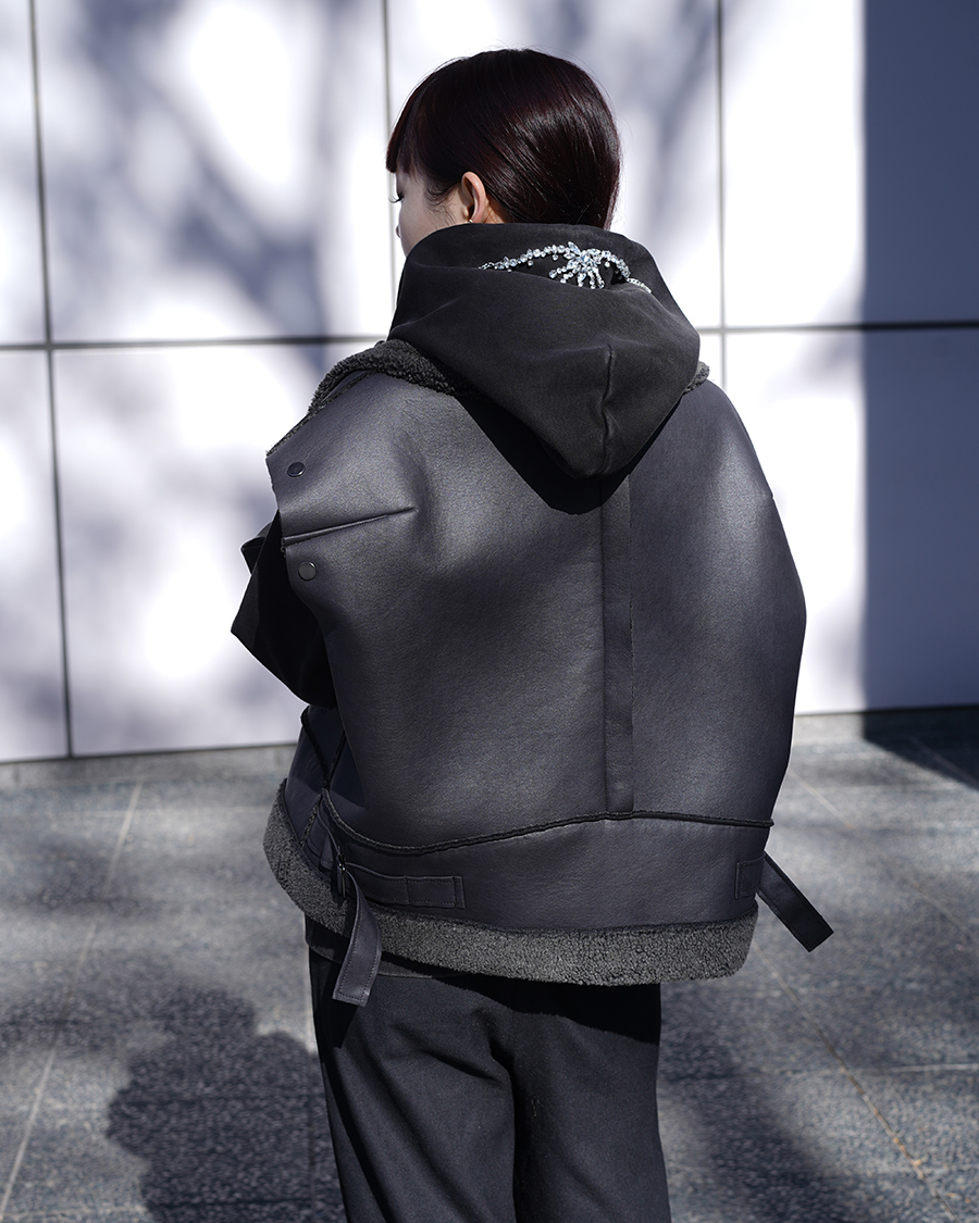 フードを被っていない時もビジューがあることによって、バックスタイルが華やかなのも良い。
