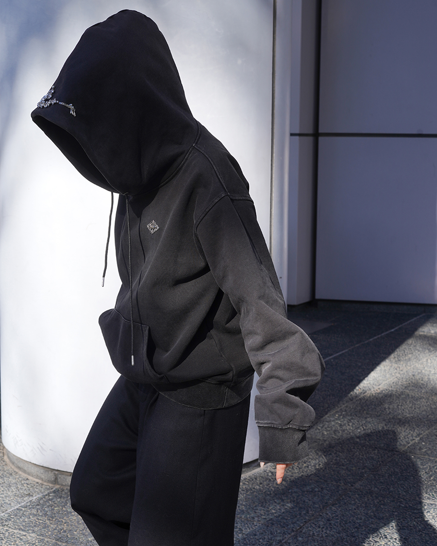 フーディの気軽さはそのままに、ビジューがついていることによって華やかさがプラスされ、カジュアルにもモードにもすっと馴染んでくれます。
