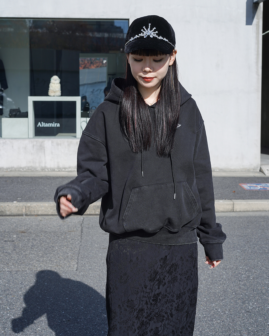 カジュアルな印象のフーディにビジューをのせた意外性のある組み合わせのデザインだからこそスタイリングの振り幅が多い一着。