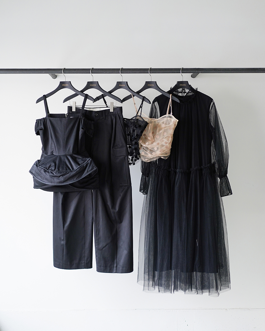 第一便では、ボリュームのあるシルエットのトップスとパンツのセットアップ、そしてブランドでも定評のあるチュールビスチェやAラインドレスなど、Chika Kisadaらしさが溢れるアイテムが入荷して参りました。
