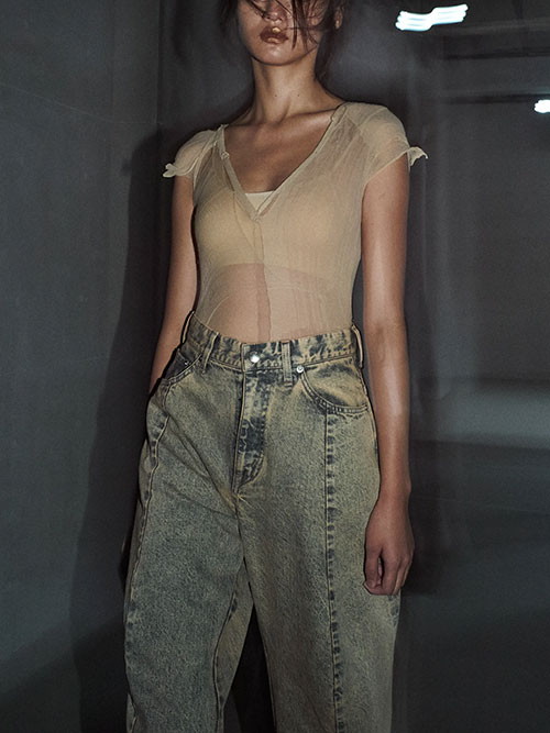 パンツは先シーズンに登場したフレアデニムのシルエットになっており、セットアップで着るととてもボリューミーなシルエットに。